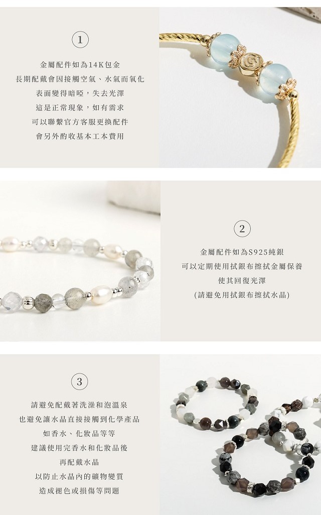 ③此款水晶手鍊以彈力線製作,平常配戴時珠子會滾動,線頭跑出來是正常狀況,只要把線頭拉進珠子裡藏起來即可。