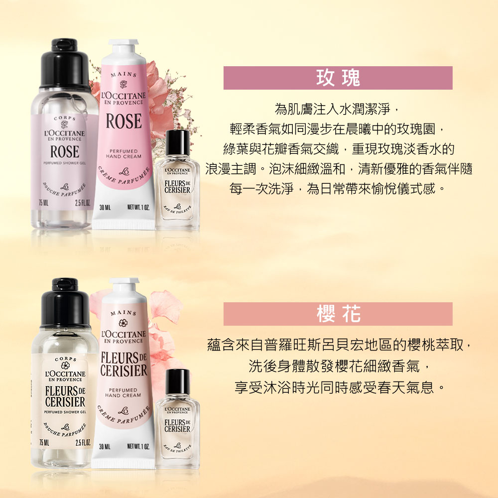蘊含來自普羅旺斯呂貝宏地區的櫻桃萃取,洗後身體散發櫻花細緻香氣,享受沐浴時光同時感受春天氣息。