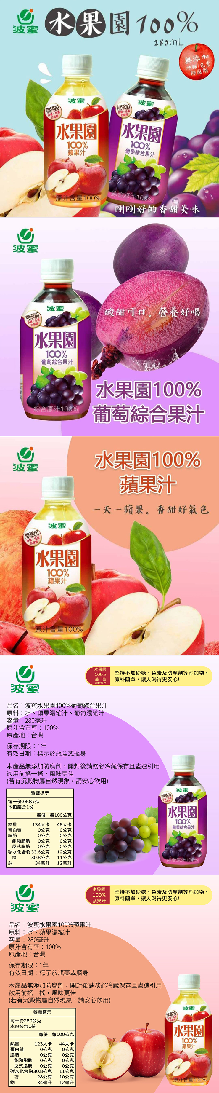 名稱:【波蜜】水果園100%葡萄汁/蘋果汁280mlX24瓶/箱