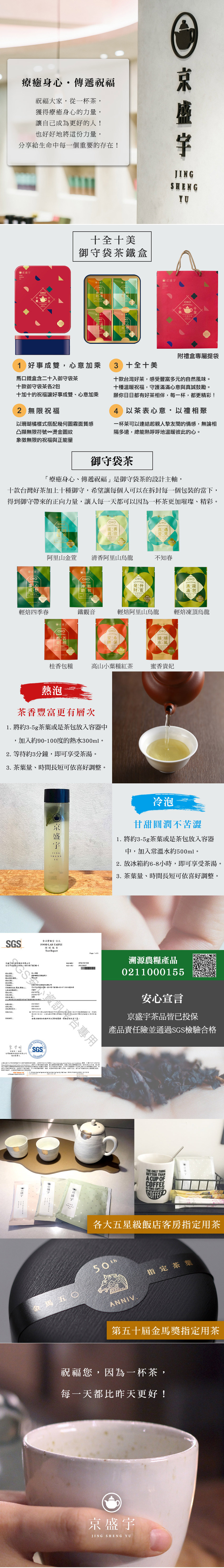 商品品名:十全十美御守袋茶鐵盒組合/規格:20入茶包/盒重量:不知春3g x 2 阿里山金萱3g x 2 清香阿里山烏龍3g x 2 輕焙四季春2.5g x 2 輕焙凍頂烏龍2.5g x 2 輕焙阿里山烏龍2.5g x 2 鐵觀音2.5g x 2 桂香包種2.5g x 2 高山小葉種紅茶2.5g x 2 蜜香貴妃2.5g x 2內容物成分:茶葉原產地(國):台灣食品添加物名稱:無