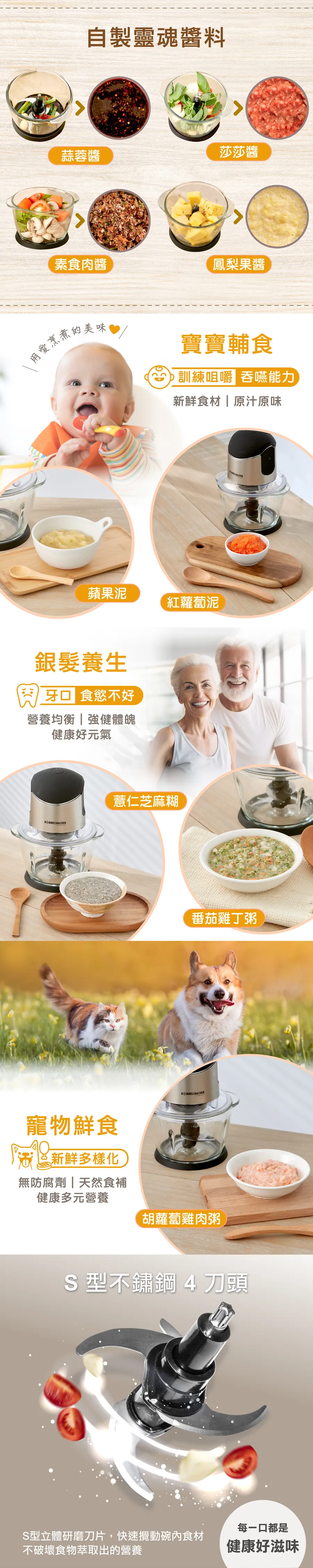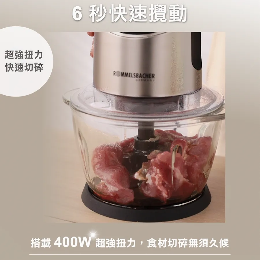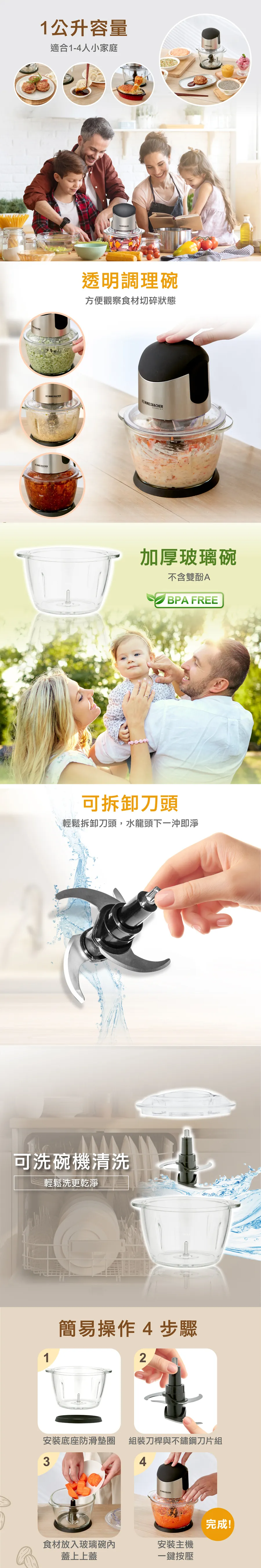 一壓即轉,省時省力S型立體研磨不鏽鋼4刀頭、加厚玻璃調理碗400W 超強扭力,6秒快速切碎1公升容量,適合1~4人小家庭輕鬆拆卸,可洗碗機清洗