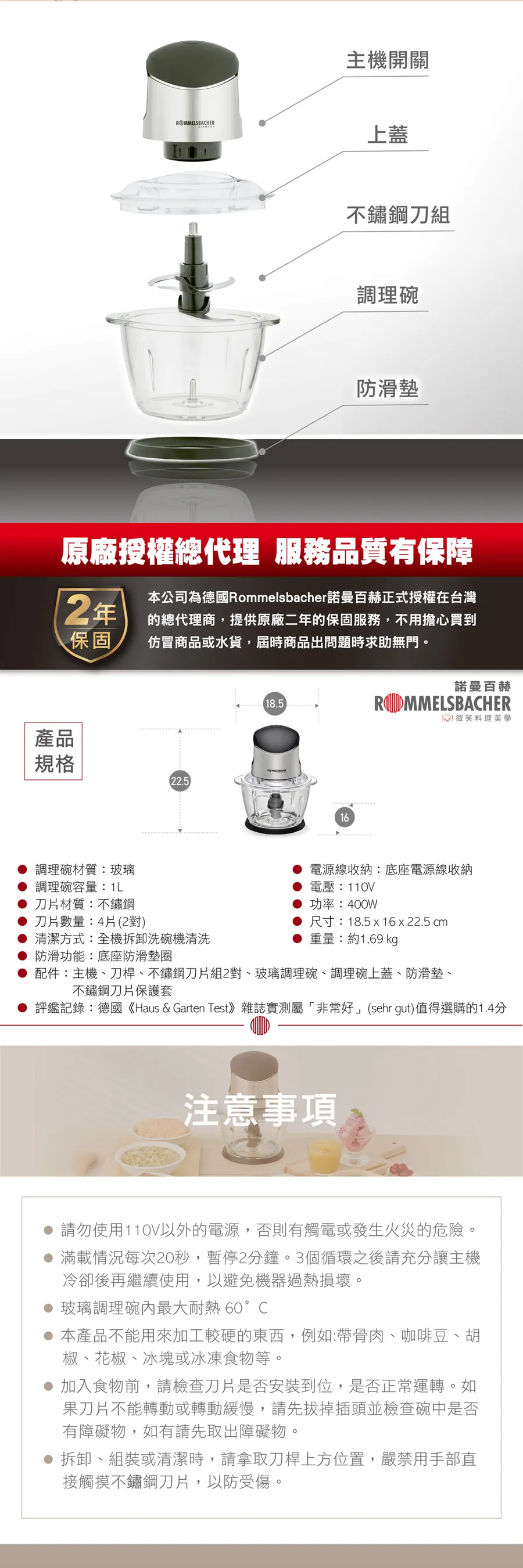 配件:主機、刀桿、不鏽鋼刀片組2對、玻璃調理碗、調理碗上蓋、防滑墊、不鏽鋼刀片保護套