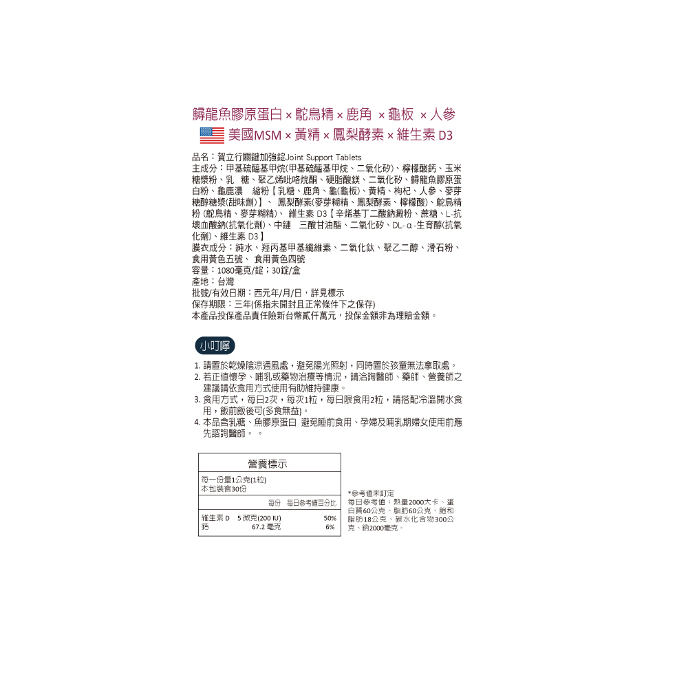 主成分:甲基硫醯基甲烷(Methylsulfonyl Methane, MSM) (甲基硫醯基甲烷、二氧化矽)、檸檬酸鈣、玉米糖漿粉、乳 糖、聚乙烯吡咯烷酮、硬脂酸鎂、二氧化矽、鱘龍魚膠原蛋白粉、龜鹿濃 縮粉【乳糖、鹿角、龜(龜板)、黃精、枸杞、人參、麥芽糖醇糖漿(甜味劑)】、 鳳梨酵素(麥芽糊精、鳳梨酵素、檸檬酸)、鴕鳥精粉 (鴕鳥精、麥芽糊精)、 維生素 D3【辛烯基丁二酸鈉澱粉、蔗糖、L-抗壞血酸鈉(抗氧化劑)、中鏈 三酸甘油酯、二氧化矽、DL-α-生育醇(抗氧化劑)、維生素 D3】\膜衣成分:純水、羥丙基甲基纖維素、二氧化鈦、聚乙二醇、滑石粉、食用黃色五號、 食用黃色四號