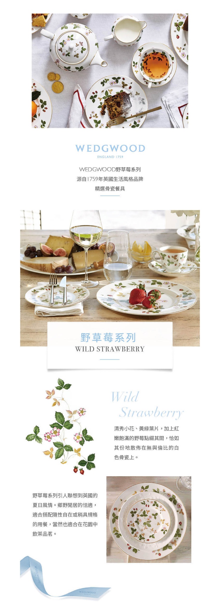 清秀小花、黃綠葉片,加上紅嫩飽滿的野莓點綴其間,恰如其份地散佈在Wedgwood無與倫比的白色骨瓷上。溫和寧靜,雖是傳統工藝卻具現代美感,讓野草莓成為現代經典之作。 幾百年來,Wedgwood不斷在自然中發掘設計謬斯,從品牌創始人至後續傳人都對自然情有獨鍾,讓Wedgwood從自然取材的創作靈感代代相傳、綿延至今。 野草莓秀氣、細緻的花色,引人聯想英格蘭的夏日,鄉野閒居的恬適,適合搭配隨性自在或稍具規格的用餐,當然也適合在花園中飲茶品茗。1965年出品以來,這套瓷組也理所當然成為送禮時餽贈小姐女士的不二選擇。