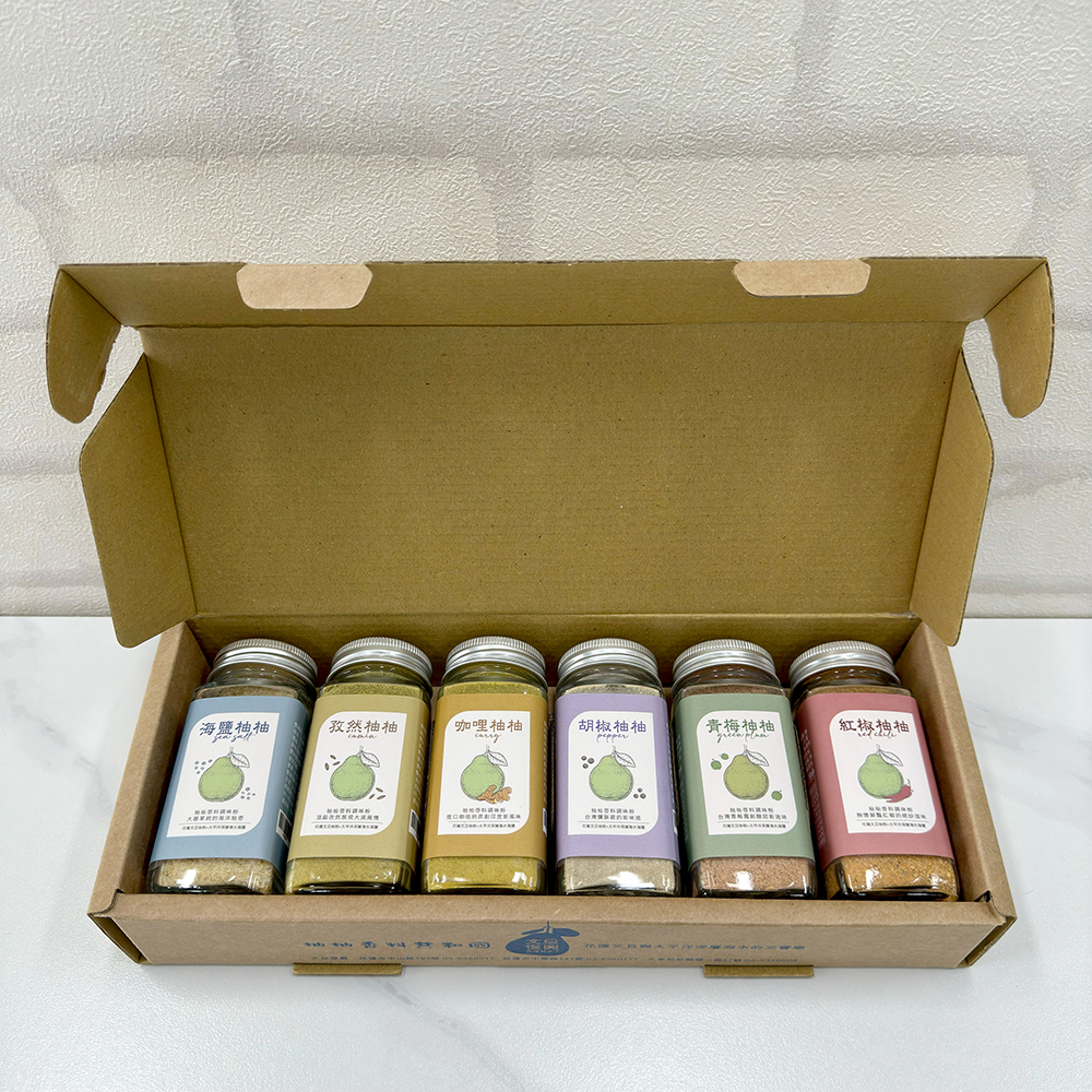 「柚柚深層海鹽系列灑粉」是台灣第一次將文旦柚製作成系列調味香料,每一款風味都採用了太平洋深層海水精製海鹽。共有六款異國風味:1.柚香海鹽撒粉:簡單調味,顯現出大器單純的海洋柚香。2.柚香孜然撒粉:進口頂級孜然,形成多層次的大漠料理風情。3.柚香咖哩撒粉:進口咖哩香料,調製正宗印度咖哩撒粉。4.柚香胡椒撒粉:依台灣鹽酥雞的口味調配而成,香味濃郁。5.柚香青梅撒粉:季節限定的台灣青梅,締造出酸甜新風味。6.柚香紅椒撒粉:融合熱情鮮豔的紅椒,微辣讓人食慾大開!