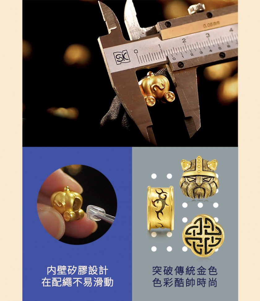 足金串珠以吉祥物「龍龜」為設計主題,採用酷黑黃金工藝,質感精緻細膩。「龍龜」具備龍頭龜身,結合兩大神獸「祥瑞」與「長壽」之寓意,又與「榮歸」諧音,象徵「榮譽歸來、趨吉避凶」,為佩戴者帶來守護與祝福。