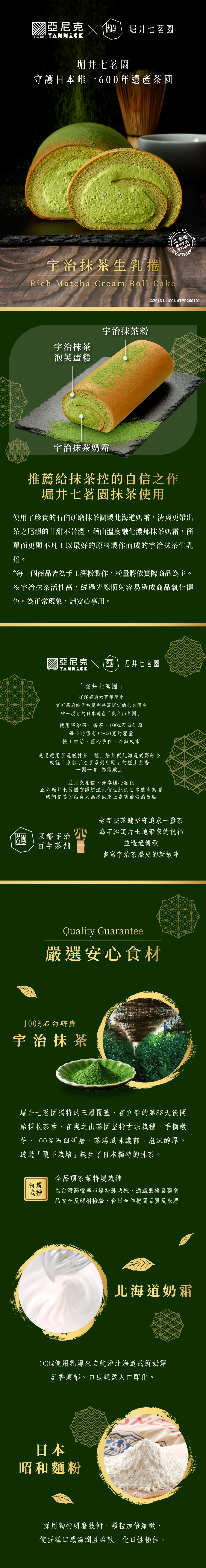 推薦給抹茶控的自信之作 堀井七茗園抹茶使用 使用了珍貴的石臼研磨抹茶調製北海道奶霜,清爽更帶出茶之尾韻的甘甜不苦澀,藉由溫度融化濃郁抹茶奶霜,簡單而更顯不凡! 以最好的原料製作而成的宇治抹茶生乳捲,每一個商品皆為手工灑粉製作,粉量將依實際商品為主。