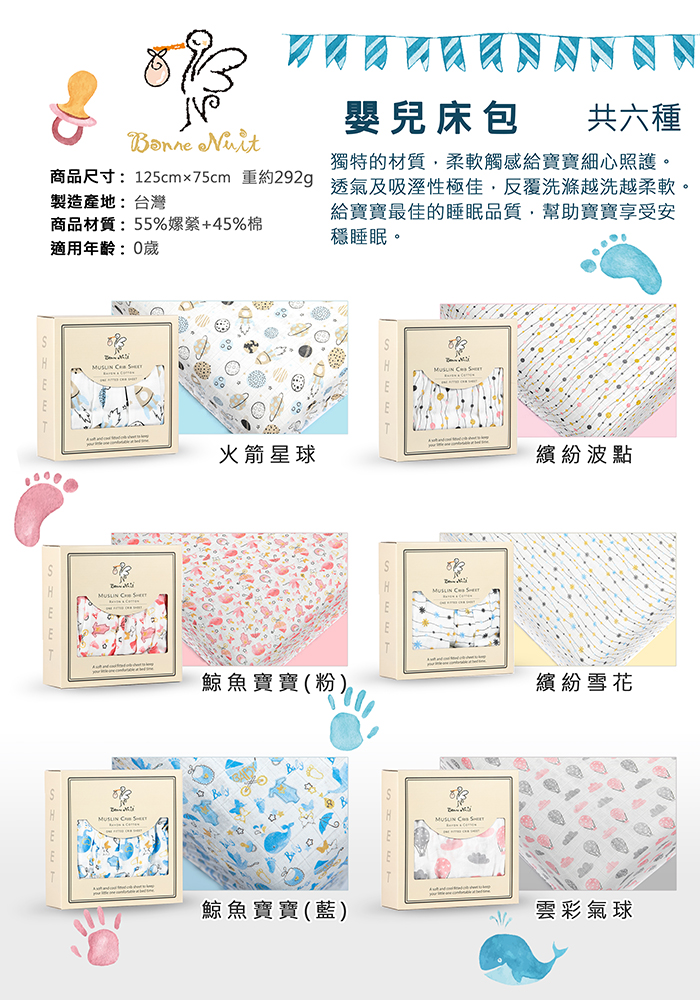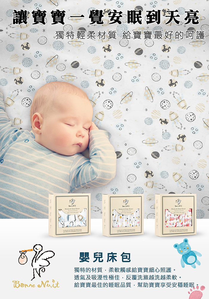 獨特的材質,柔軟觸感給寶寶細心照護。透氣及吸溼性極佳,反覆洗滌越洗越柔軟。給寶寶最佳的睡眠品質,幫助寶寶享受安穩睡眠。