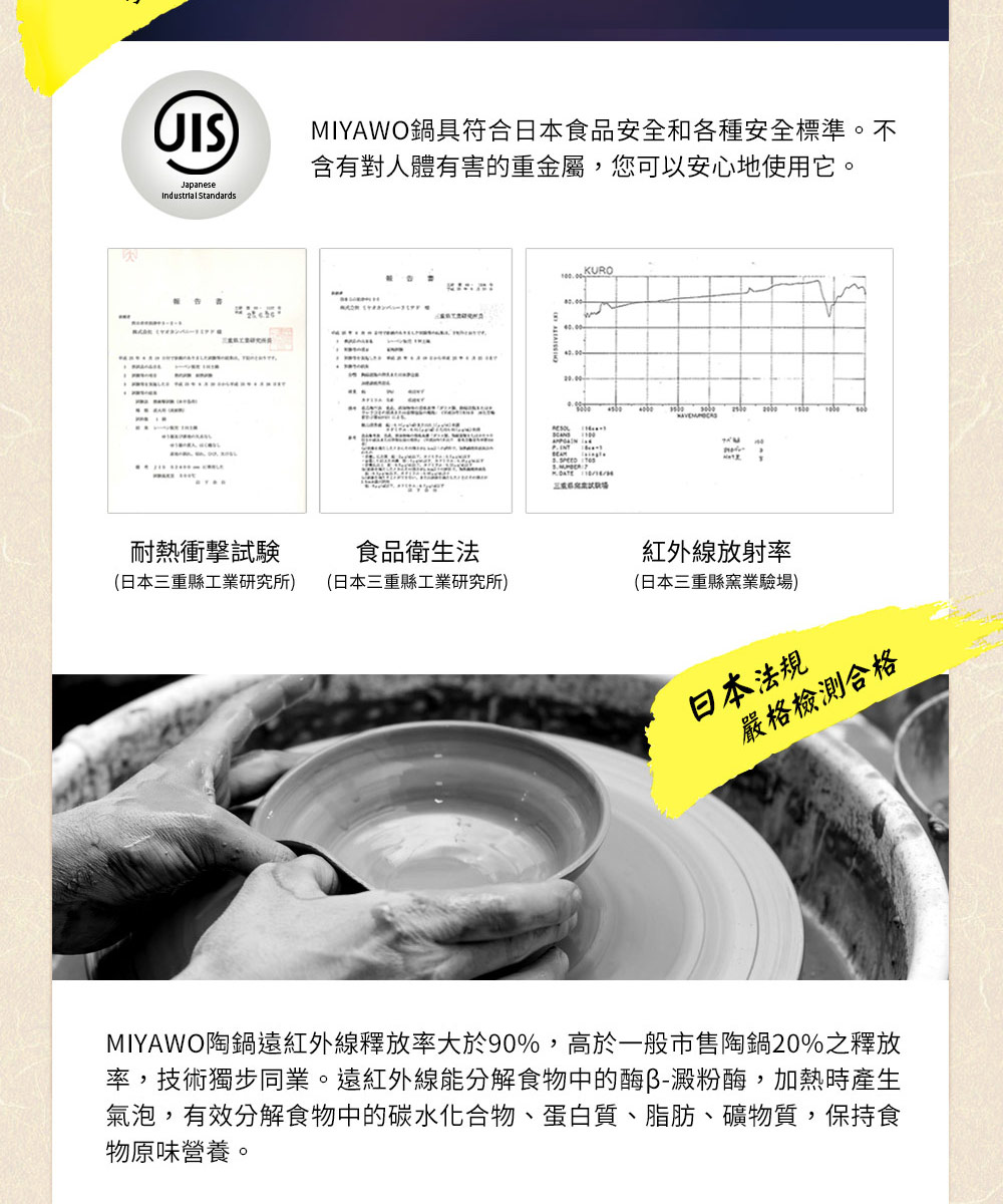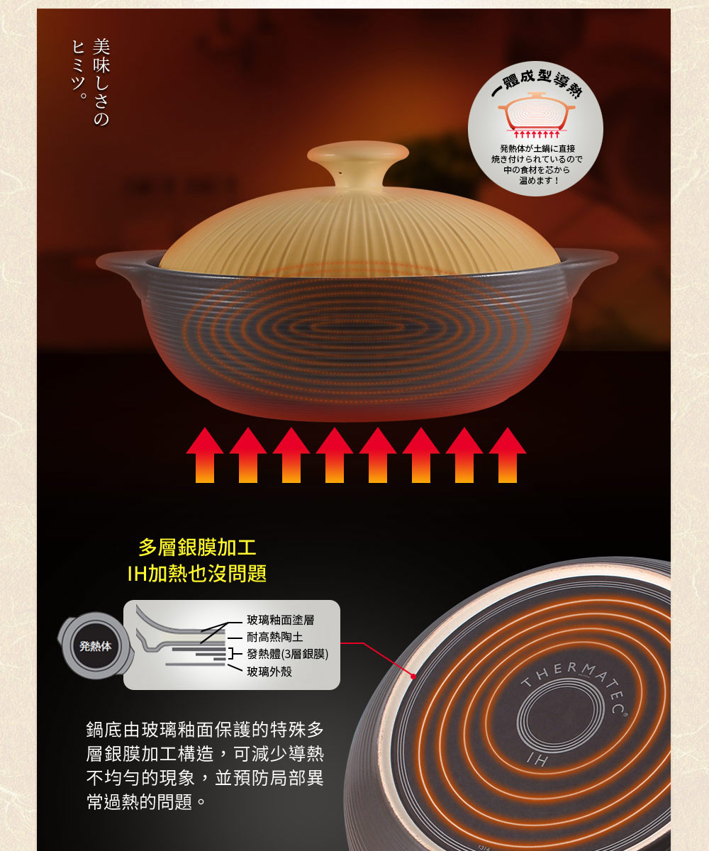 ◆IH全功能,適用各種爐具◆玻璃釉面導熱快且均勻◆紅外線功能有效保留食物營養◆吸水率0.5%以下,氣味不殘留◆耐溫差500℃以上,品質優良◆與日本同步發售