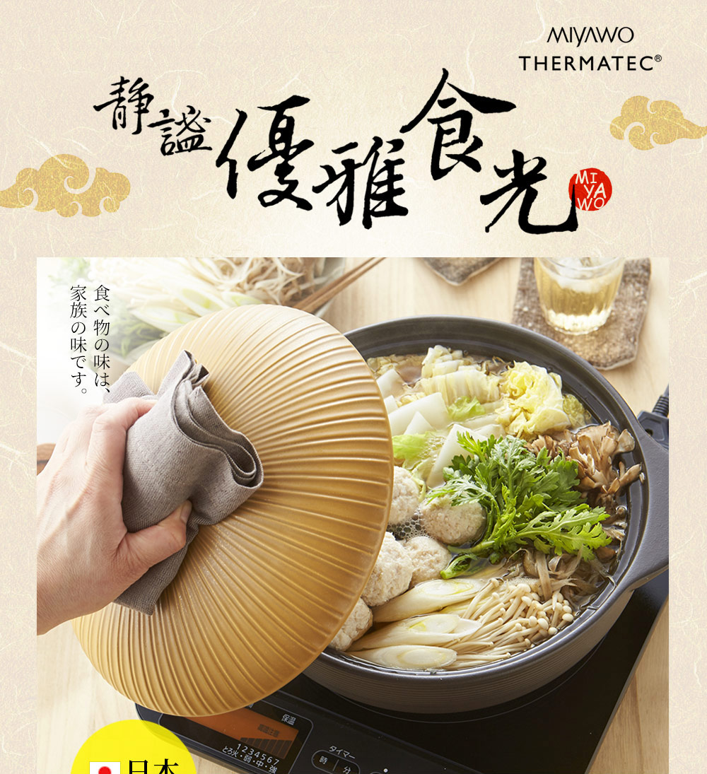 日本陶土鍋第一品牌-宮尾ミヤオ MIYAWO THERMATECⓇ-MIYAWO陶土鍋成立於1930年,是一家歷史悠久的高級陶瓷品製造商,曾獲得日本經濟產業省頒發《日本製造大獎》,並表揚為"支持明天的日本製造健康的產品300企業之一"。