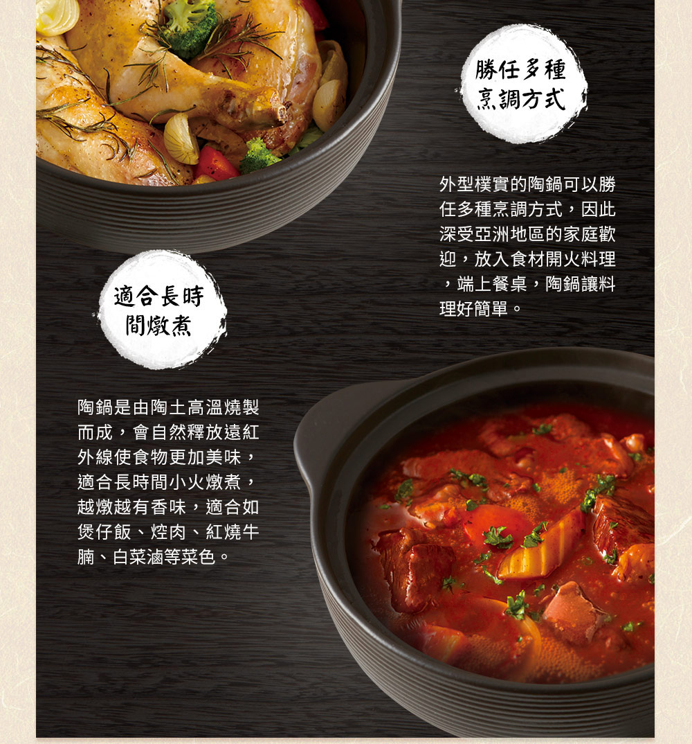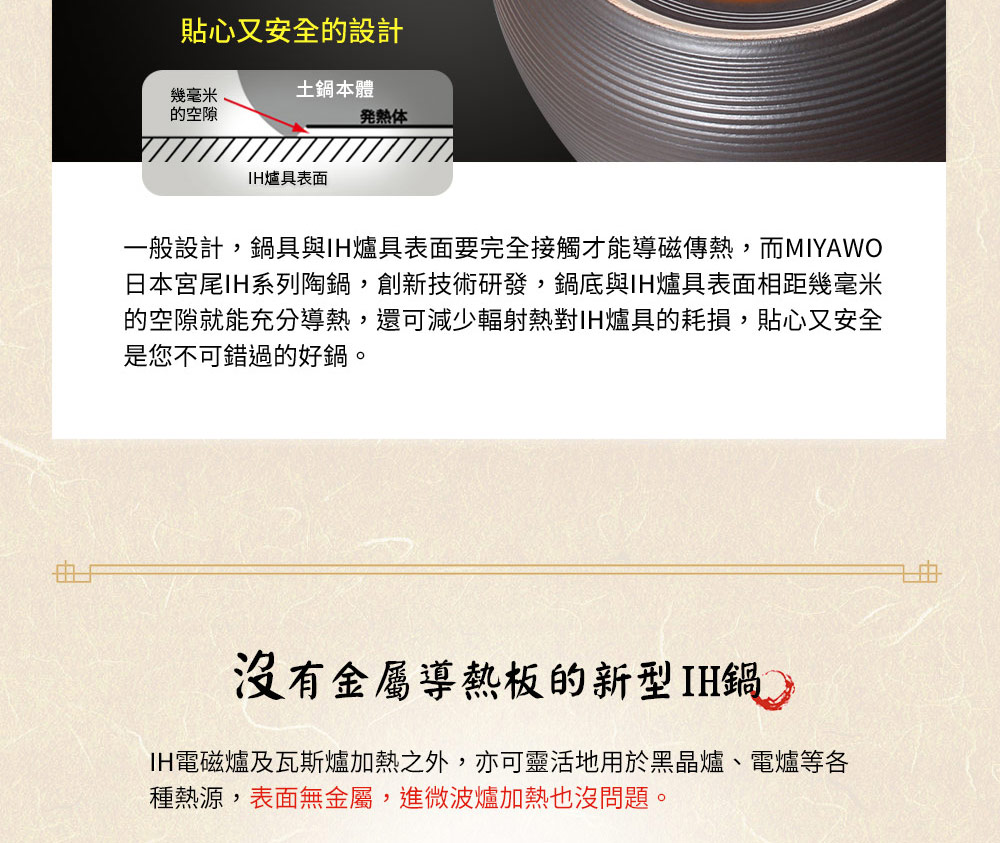 ◆玻璃釉面導熱快且均勻,退熱慢,聚熱效果佳,節約能源。◆紅外線功能MIYAWO陶土鍋遠紅外線放射率大於90%,高於一般市售陶土鍋20%之放射率,技術獨步同業。紅外線能分解食物中的酶β──澱粉酶,加熱時產生氣泡,有效分解食物中碳化合物、蛋白質、脂肪、礦物質,保持食物原味營養。◆氣味不殘留吸水率0.5%以下,食材氣味不殘留,容易清洗;一般市售陶土鍋吸水率3-5%,毛細孔會吸附食材味道,長時間不使用,容易滋生細菌與發霉。◆耐溫差500℃以上冷熱溫差可達500℃以上,可從冰箱取出直接加熱,品質安全無虞;一般市售陶土鍋耐溫差僅約200℃較易爆裂。◆IH全功能適用各種爐具:IH爐、電磁爐、電爐、瓦斯爐、黑晶爐、遠紅外線爐、電陶爐、水波爐、烤箱、電鍋、微波爐等,亦適用烘碗機。◆與日本同步發售