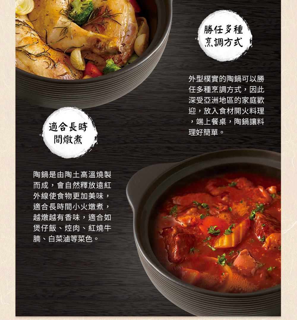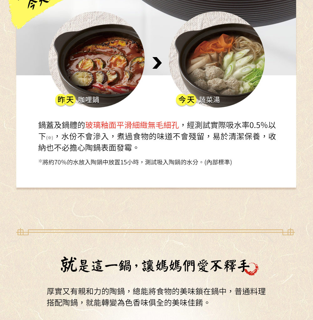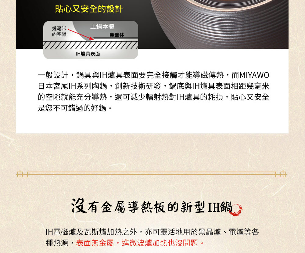 ◆玻璃釉面導熱快且均勻,退熱慢,聚熱效果佳,節約能源。◆紅外線功能MIYAWO陶土鍋遠紅外線放射率大於90%,高於一般市售陶土鍋20%之放射率,技術獨步同業。紅外線能分解食物中的酶β──澱粉酶,加熱時產生氣泡,有效分解食物中碳化合物、蛋白質、脂肪、礦物質,保持食物原味營養。◆氣味不殘留吸水率0.5%以下,食材氣味不殘留,容易清洗;一般市售陶土鍋吸水率3-5%,毛細孔會吸附食材味道,長時間不使用,容易滋生細菌與發霉。◆耐溫差500℃以上冷熱溫差可達500℃以上,可從冰箱取出直接加熱,品質安全無虞;一般市售陶土鍋耐溫差僅約200℃較易爆裂。◆IH全功能適用各種爐具:IH爐、電磁爐、電爐、瓦斯爐、黑晶爐、遠紅外線爐、電陶爐、水波爐、烤箱、電鍋、微波爐等,亦適用烘碗機。◆與日本同步發售
