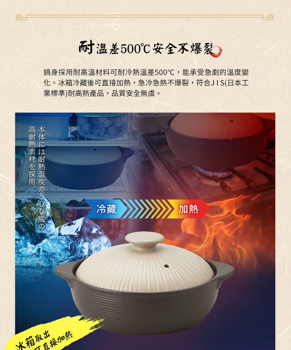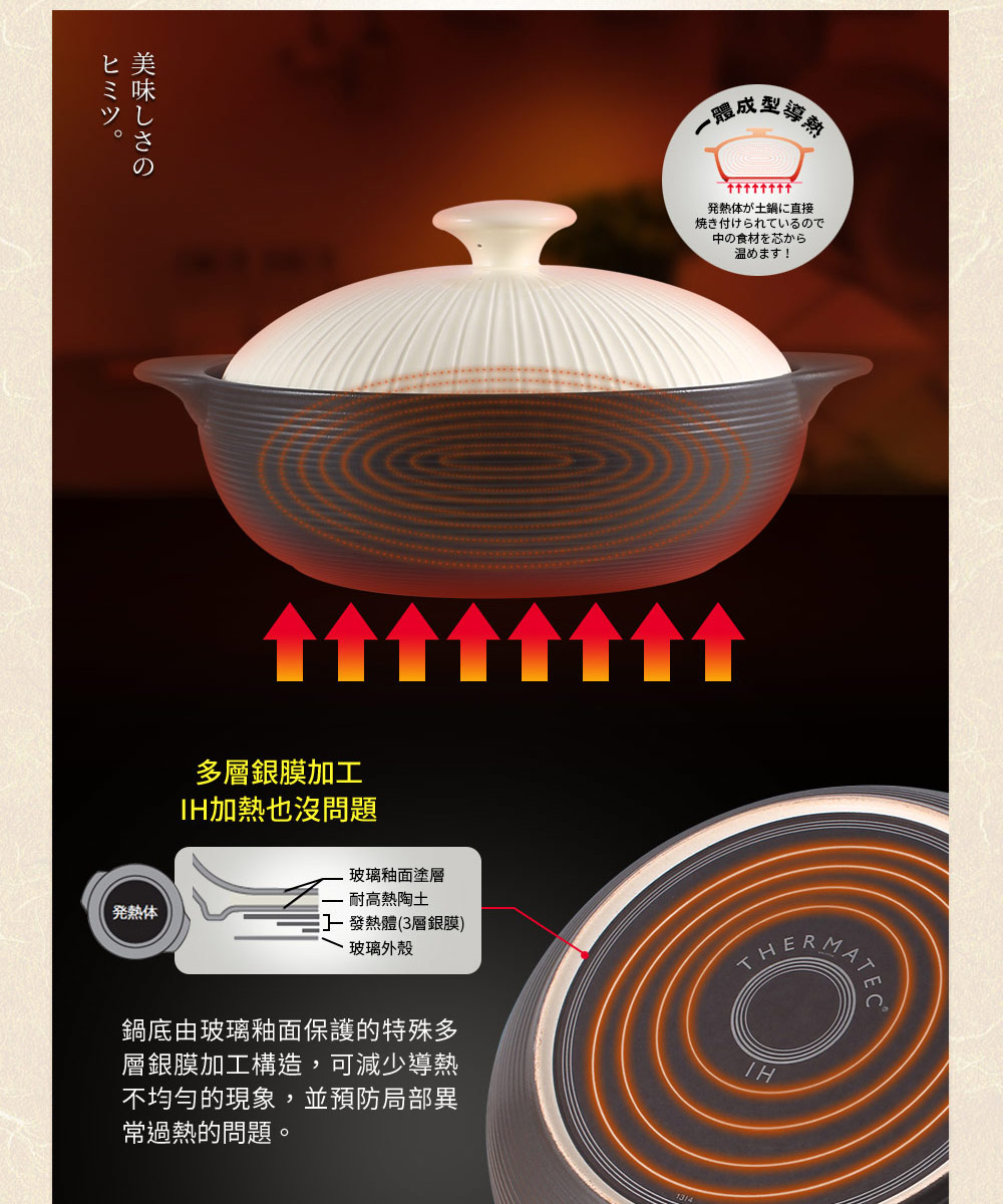 ◆IH全功能,適用各種爐具◆玻璃釉面導熱快且均勻◆紅外線功能有效保留食物營養◆吸水率0.5%以下,氣味不殘留◆耐溫差500℃以上,品質優良◆與日本同步發售