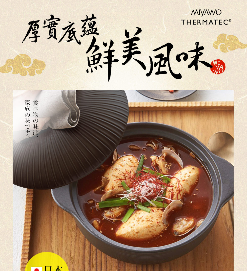 日本陶土鍋第一品牌-宮尾ミヤオ MIYAWO THERMATECⓇ-MIYAWO陶土鍋成立於1930年,是一家歷史悠久的高級陶瓷品製造商,曾獲得日本經濟產業省頒發《日本製造大獎》,並表揚為"支持明天的日本製造健康的產品300企業之一"。