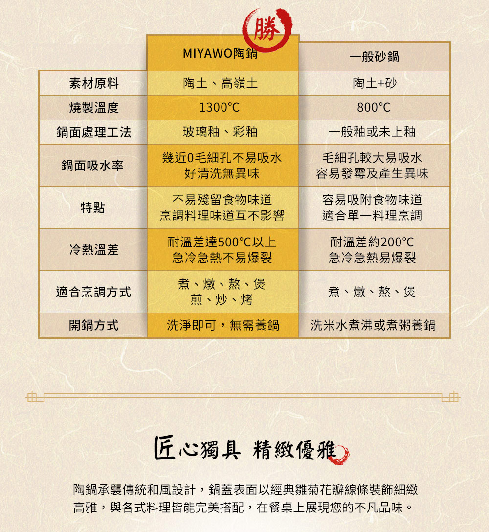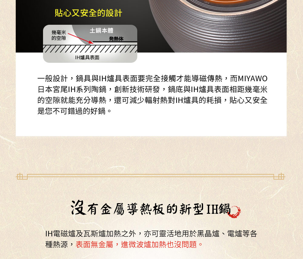 ◆玻璃釉面導熱快且均勻,退熱慢,聚熱效果佳,節約能源。◆紅外線功能MIYAWO陶土鍋遠紅外線放射率大於90%,高於一般市售陶土鍋20%之放射率,技術獨步同業。紅外線能分解食物中的酶β──澱粉酶,加熱時產生氣泡,有效分解食物中碳化合物、蛋白質、脂肪、礦物質,保持食物原味營養。◆氣味不殘留吸水率0.5%以下,食材氣味不殘留,容易清洗;一般市售陶土鍋吸水率3-5%,毛細孔會吸附食材味道,長時間不使用,容易滋生細菌與發霉。◆耐溫差500℃以上冷熱溫差可達500℃以上,可從冰箱取出直接加熱,品質安全無虞;一般市售陶土鍋耐溫差僅約200℃較易爆裂。◆IH全功能適用各種爐具:IH爐、電磁爐、電爐、瓦斯爐、黑晶爐、遠紅外線爐、電陶爐、水波爐、烤箱、電鍋、微波爐等,亦適用烘碗機。◆與日本同步發售