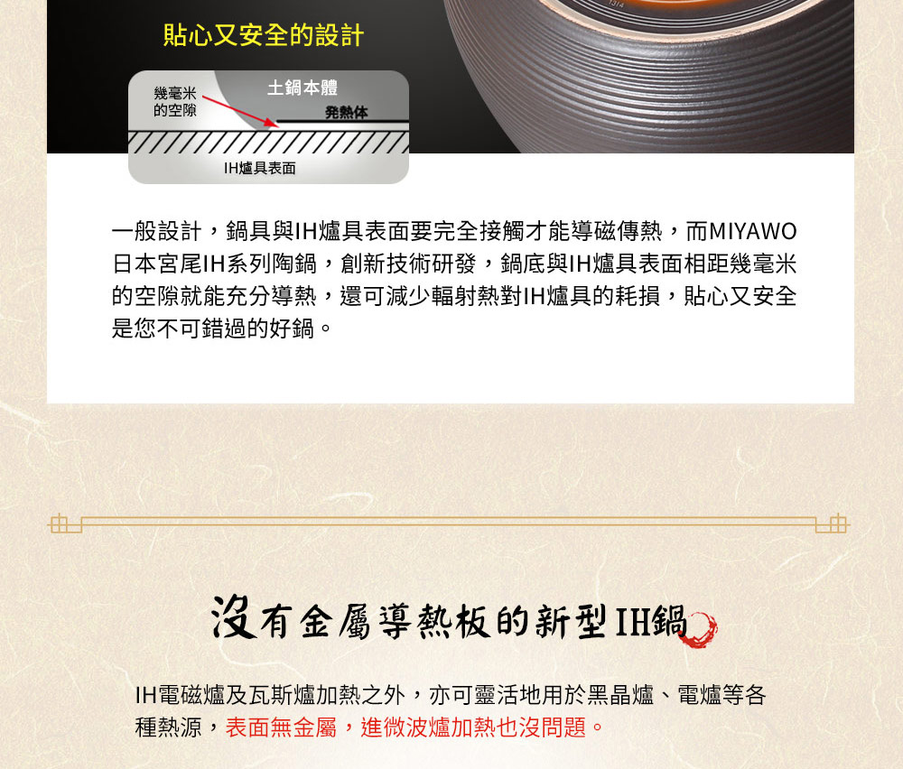 ◆玻璃釉面導熱快且均勻,退熱慢,聚熱效果佳,節約能源。◆紅外線功能MIYAWO陶土鍋遠紅外線放射率大於90%,高於一般市售陶土鍋20%之放射率,技術獨步同業。紅外線能分解食物中的酶β──澱粉酶,加熱時產生氣泡,有效分解食物中碳化合物、蛋白質、脂肪、礦物質,保持食物原味營養。◆氣味不殘留吸水率0.5%以下,食材氣味不殘留,容易清洗;一般市售陶土鍋吸水率3-5%,毛細孔會吸附食材味道,長時間不使用,容易滋生細菌與發霉。◆耐溫差500℃以上冷熱溫差可達500℃以上,可從冰箱取出直接加熱,品質安全無虞;一般市售陶土鍋耐溫差僅約200℃較易爆裂。◆IH全功能適用各種爐具:IH爐、電磁爐、電爐、瓦斯爐、黑晶爐、遠紅外線爐、電陶爐、水波爐、烤箱、電鍋、微波爐等,亦適用烘碗機。◆與日本同步發售