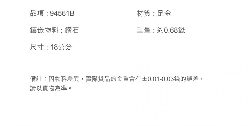 ‧款式:手鍊‧款號:94561B‧材質:足金‧鑲嵌物料:鑽石