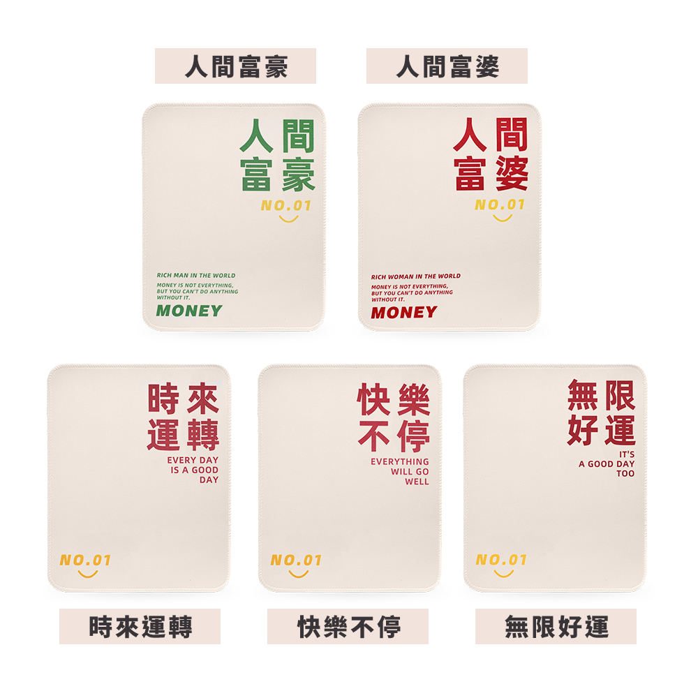 名稱: 高耐磨滑鼠墊-多款可選-時來運轉/快樂不停/無限好運/人間富婆/人間富豪(21X26cm) 尺寸:21X26cm材質:有圖案面:布 底部:橡膠◎使用方式:一般使用方式。