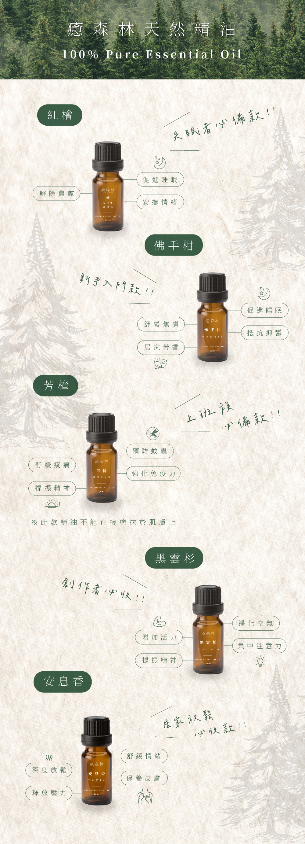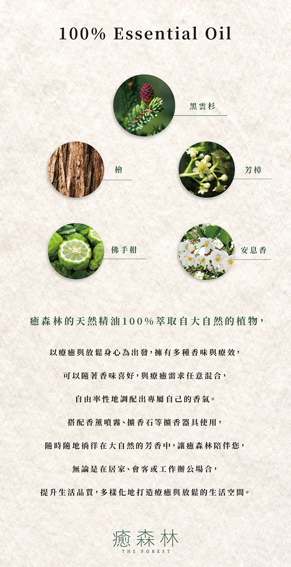 ● 室內香氛:於水氧機中以100ml的水,滴3-4滴的比例調配,可同時混和幾款精油增加香味層次