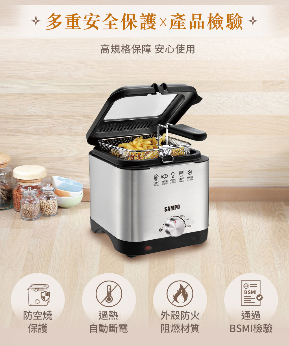 ◆1.5L輕巧油量,精省油量也能吃酥脆炸物。◆900W大功率,加熱速度快。◆150~190度C油溫控制,可依據食材調整。◆內鍋食品級雙層水性不沾黏,清潔好容易。◆分離式炸籃+瀝油掛勾設計。◆可拆卸透視上蓋,隨時掌控料理上色狀況。◆鍋體倒油槽設計,輕鬆方便好倒油。◆不鏽鋼外觀+精緻防燙旋鈕,質感100分。◆底部貼心內凹式提把,輕巧好移動。◆防滑腳墊,穩固放置不移位。◆多重安全防護:防空燒、過熱斷電、外殼防火阻燃材質。