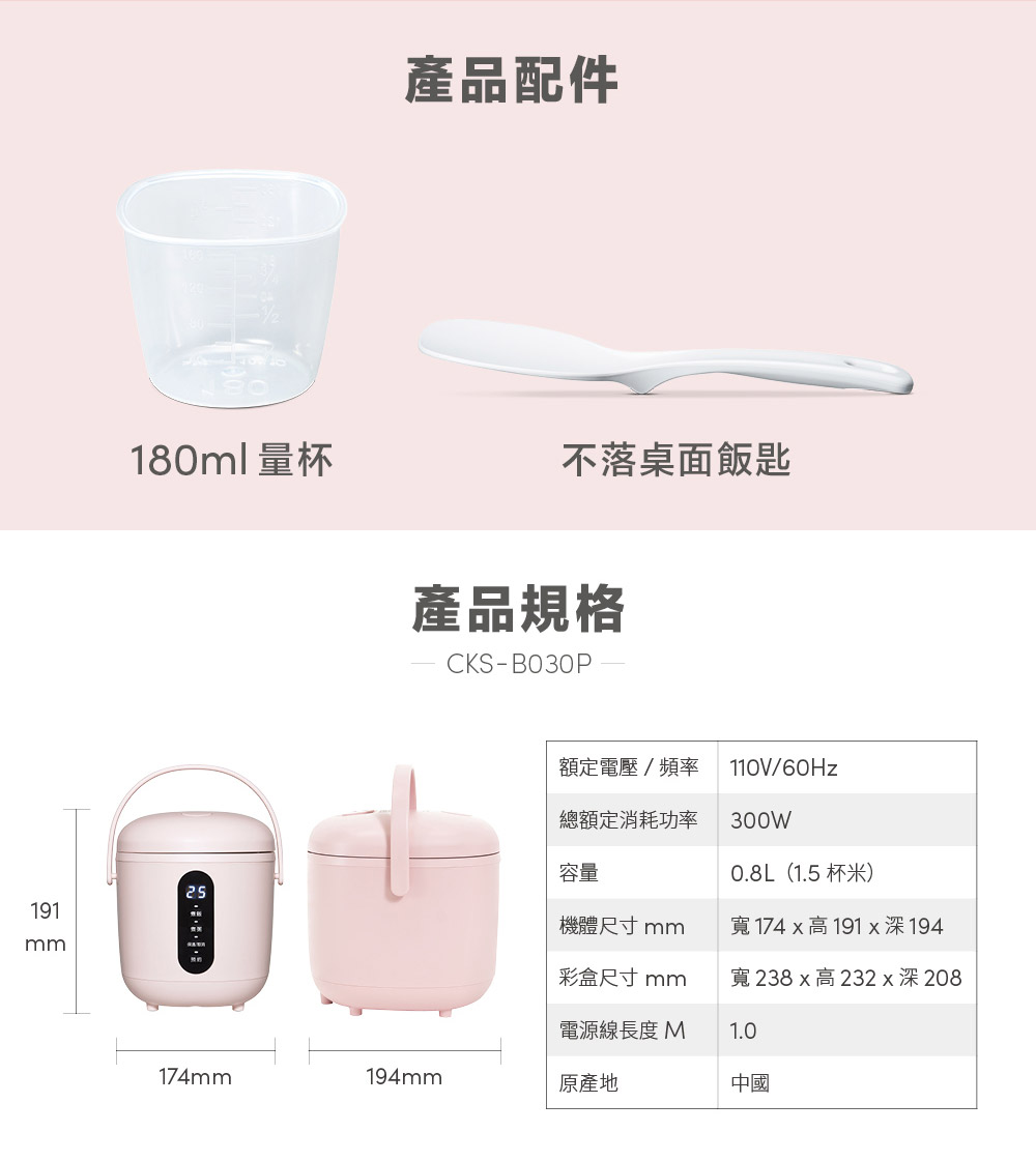 ◆機體尺寸:寬174 x 高191 x 深194 (mm)◆機體重量:1.5 Kg◆額定電壓及額定頻率:110V/60Hz◆總額定消耗電功率:300W◆熱效率值:75.0%◆容量:1.5杯米◆可拆卸內蓋板材質:鋁合金◆飯匙、量杯材質:PP◆內鍋材質:鋁合金、鐵氟龍塗層◆電源線長度:1公尺◆產地:中國◆國際條碼:4718060385390◆BSMI認證字號:R55287◆保固:正常使用下保固一年
