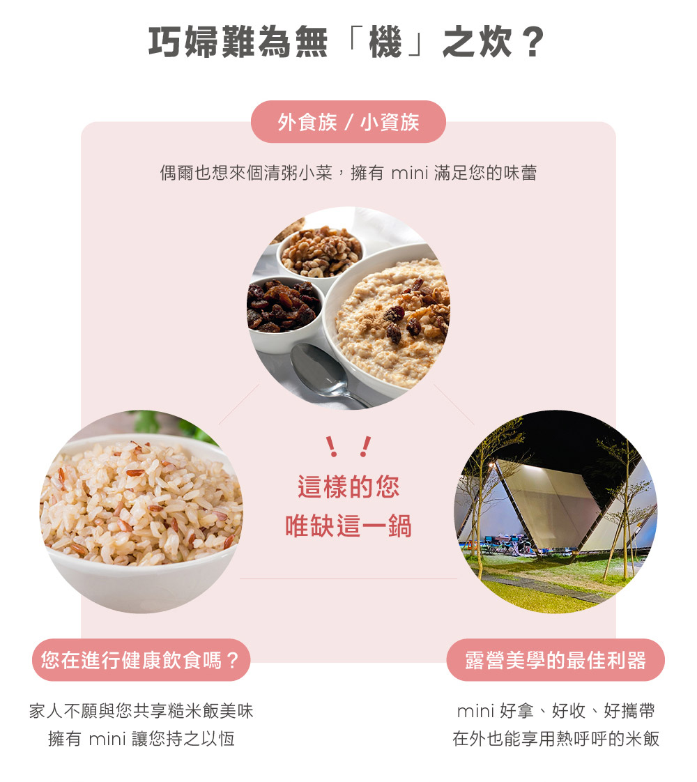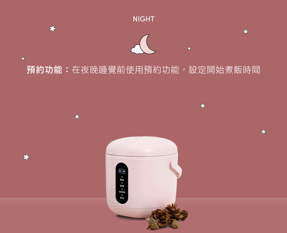 ◆1.5杯米容量,一人獨享,兩人分享,迷你新煮張!◆25分鐘快速出飯,讓您不再將就隔夜飯。◆專為台灣米而生,浸泡、加熱、沸騰、悶飯、保溫完整烹調。◆智慧感溫探針準確檢測溫度,控制各階段烹煮時間,讓米飯透芯好吃。◆1.8mm厚釜內鍋,煮出來的米粒Q透分明,不沾塗層清潔好方便。◆長達24小時預約功能,不論早晨或夜晚都能即刻享用熱騰騰的飯。◆可拆洗式的內蓋及蒸氣閥,清潔好方便。◆提式把手,好拿、好收、好攜帶,是您露營的最佳良伴,在外也能享用熱呼呼的米飯。◆附配件:飯匙、量杯。