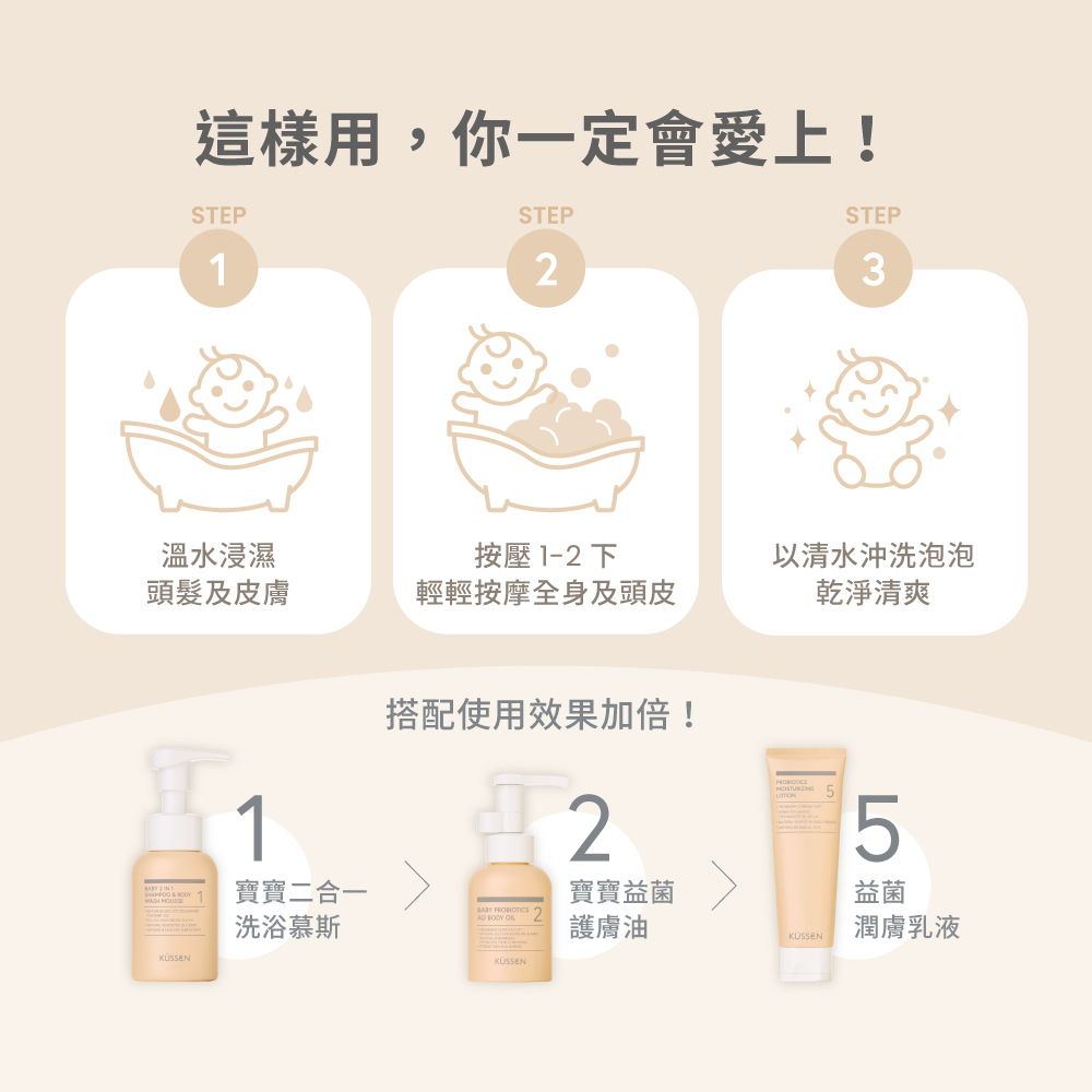 先以溫水弄濕頭髮和皮膚,按壓1~2下後輕輕按摩並徹底清洗全身和頭皮,再以清水沖洗乾淨。