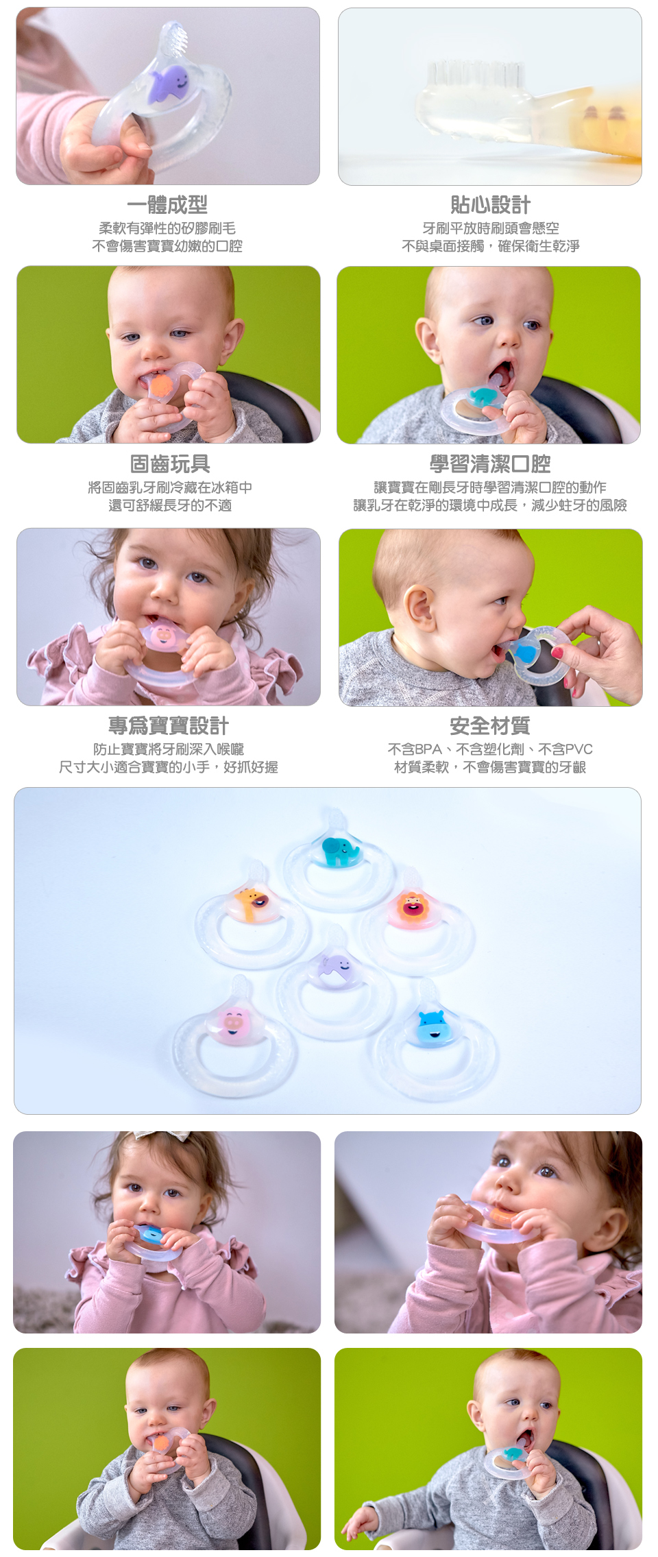 .讓寶寶在剛長牙時學習清潔口腔(牙齦、舌頭)的動作,讓乳牙在乾淨衛生的環境中成長,減少蛀牙的風險。