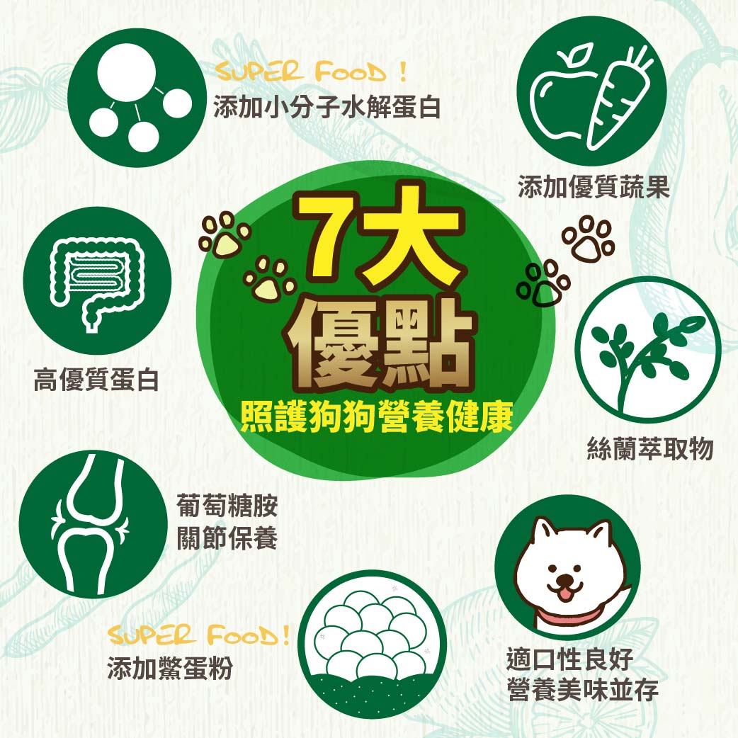 蔬果(甜菜根,地瓜,黑芝麻,番茄,詣果,胡蘿萄)·水解難肉蛋白3%。