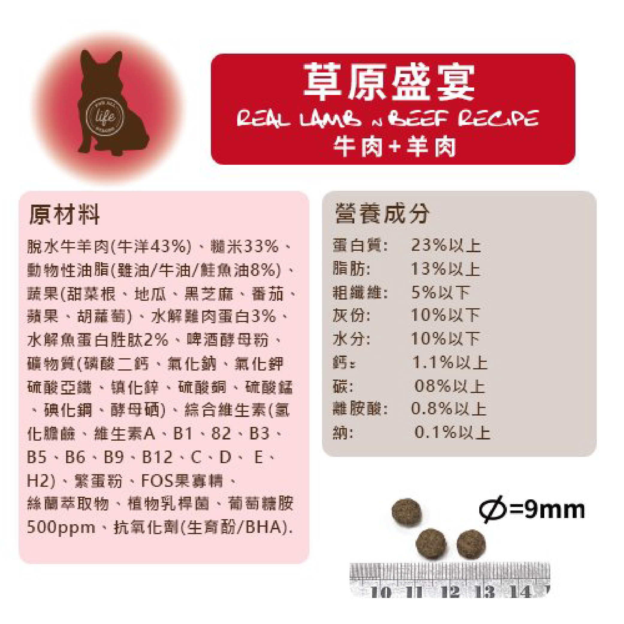 脫水牛羊肉(牛洋43%),糙米33%,動物性油脂(雖油/牛油/鮭魚油8%),