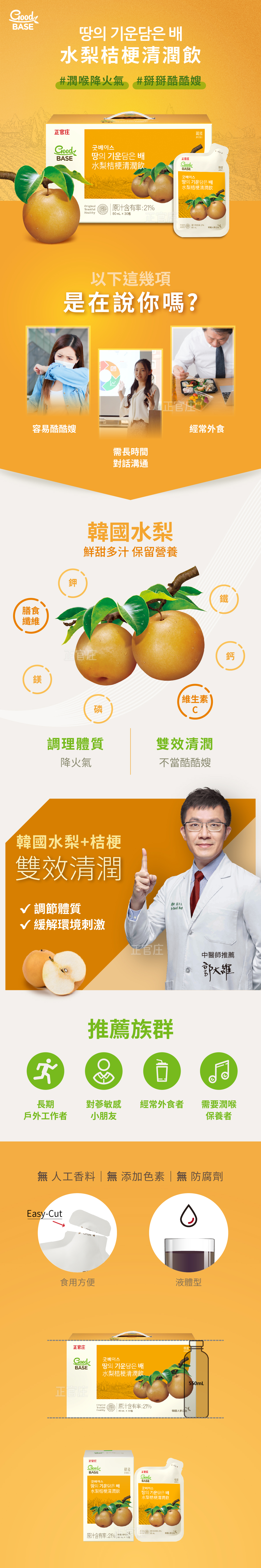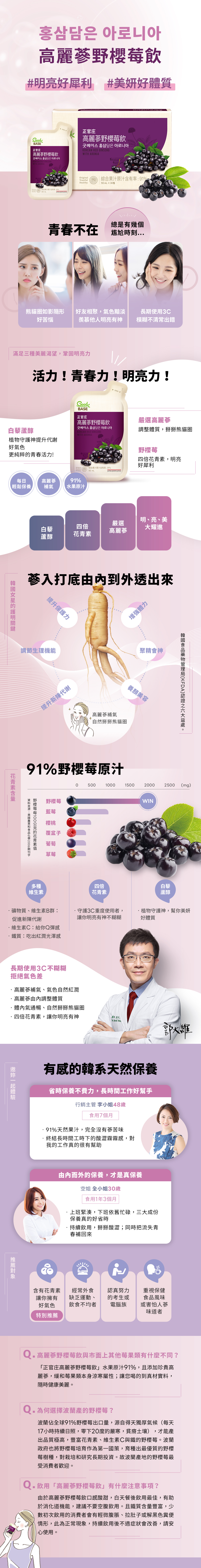產品成分天然綜合果汁(野櫻莓、葡萄、水梨)、龍舌蘭糖漿、高麗蔘萃取物、天然香料