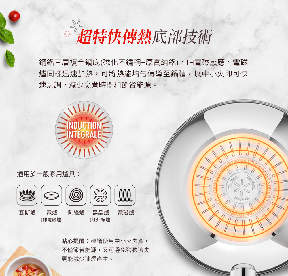 4.特福不沾鍋因鍋底設計具有高傳熱功能,建議用中小火烹調即可,節省能源又可避免營養流失,更能減少油煙的產生。