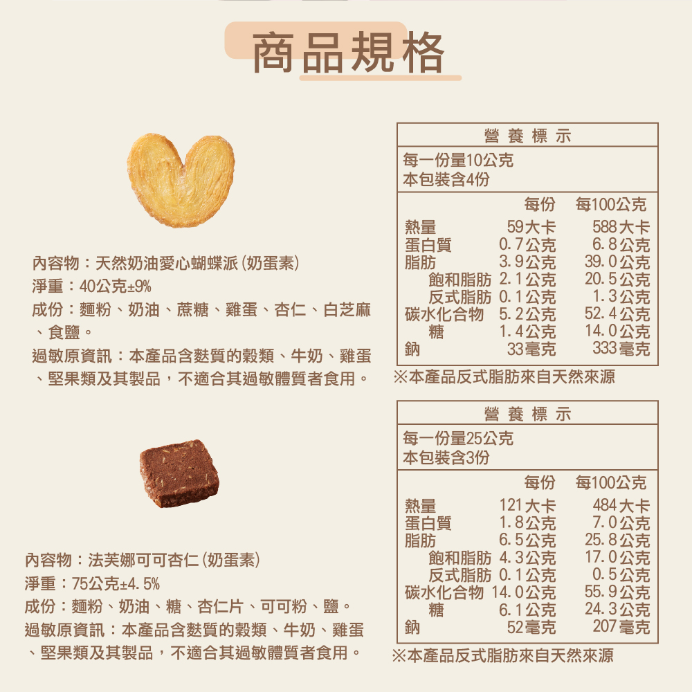 ✔️純粹的成分非凡的口感,使用紐西蘭原裝進口天然奶油為基底,層層堆疊出768層派皮層次,溫火慢烤後展開成形,奶香濃郁的酥脆蝴蝶酥,餅乾界LV的天然奶油愛心蝴蝶派。