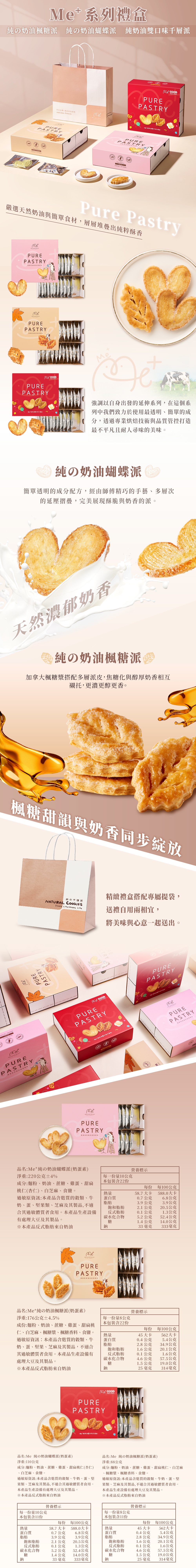 嚴選頂級食材,全新推出me+ (發音me plus)系列透明餅乾產品「純の千層派」,透明的成分、透明的來源、透明的配方,以健康為優先,全家人一起安心享用的暖心透明餅乾。麵粉與糖被師父揉捻延壓、用天然牛乳提煉餵養灌溉,層層堆疊,慢火烘烤,用溫和的配方、天然的食材,輕聲細語著幸福的秘方。
