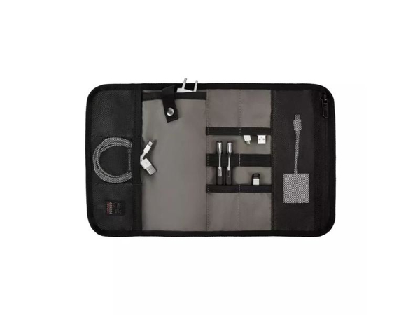 分類放置充電器、電線、USB、筆,並可掛在容易拿取的位置,精巧的三摺設計可單獨使用