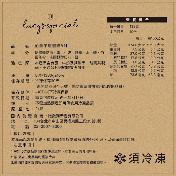 2.商品品名:【LS手作甜點】伯爵千層蛋糕(8吋)