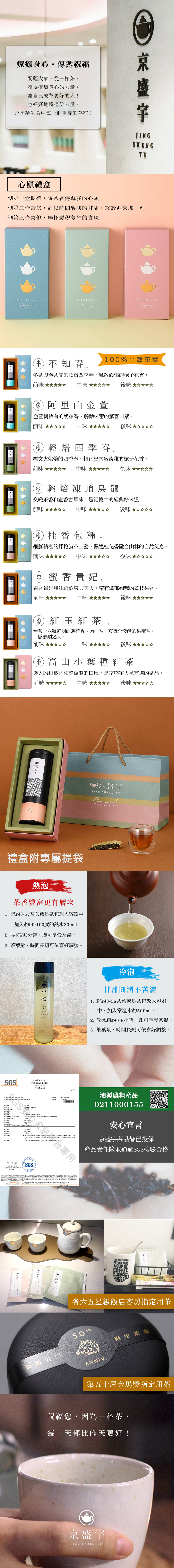 ★禮盒顏色與口味皆為固定搭配,無法調整替換/商品品名:心願禮盒|不知春100g罐裝茶葉重(容)量/規格:100g/袋內容物成分:茶葉食品添加物名稱:無原產地(國):台灣/商品品名:心願禮盒|蜜香貴妃100g罐裝茶葉重(容)量/規格:100g/袋內容物成分:茶葉食品添加物名稱:無原產地(國):台灣/商品品名:心願禮盒|紅玉紅茶50g罐裝茶葉重(容)量/規格:50g/袋內容物成分:茶葉食品添加物名稱:無原產地(國):台灣/商品品名:心願禮盒|阿里山金萱100g罐裝茶葉重(容)量/規格:100g/袋內容物成分:茶葉食品添加物名稱:無原產地(國):台灣/商品品名:心願禮盒|輕焙凍頂烏龍100g罐裝茶葉重(容)量/規格:100g/袋內容物成分:茶葉食品添加物名稱:無原產地(國):台灣/商品品名:心願禮盒|桂香包種50g罐裝茶葉重(容)量/規格:50g/袋內容物成分:茶葉食品添加物名稱:無原產地(國):台灣/商品品名:心願禮盒|輕焙四季春100g罐裝茶葉重(容)量/規格:100g/袋內容物成分:茶葉食品添加物名稱:無原產地(國):台灣/保存期限:2年 (不知春/阿里山金萱/桂香包種) / 3年 (輕焙四季春.輕焙凍頂烏龍.紅玉紅茶.高山小葉種紅茶/蜜香貴妃)投保產品責任險字號:新安產險/17225字第11ML000168號