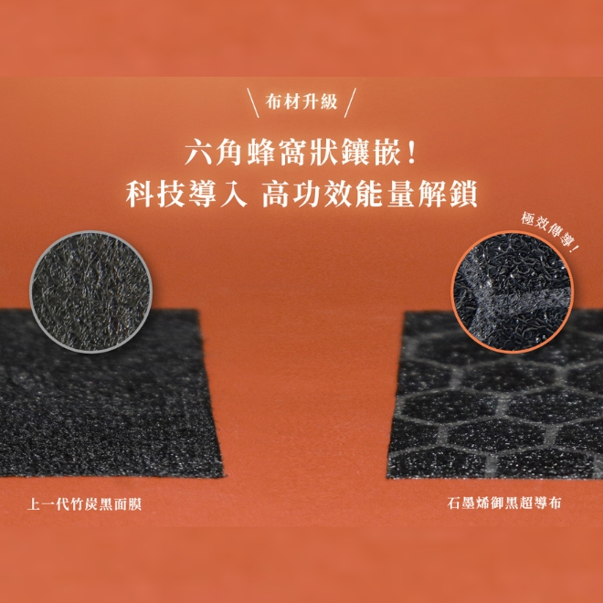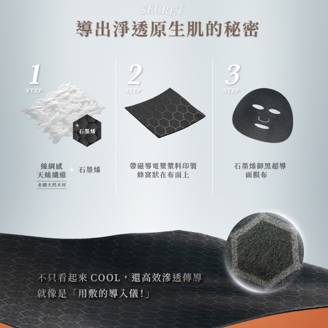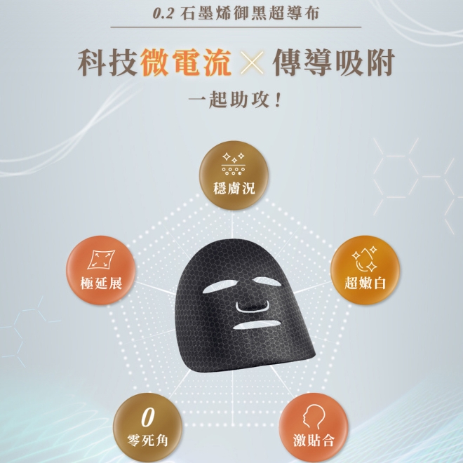 以六角蜂窩狀鑲嵌,石墨烯御黑超導布,添加蜜香紅茶萃取、吉野櫻花萃取、維他命C葡萄糖苷、玻尿酸等滋潤肌膚重要成分。科技導入,高功效能量解鎖,極效傳導,貼合親膚加速精華滲透,十五分鐘,效能保養,讓妳回復嬰兒般的白 淨 透。