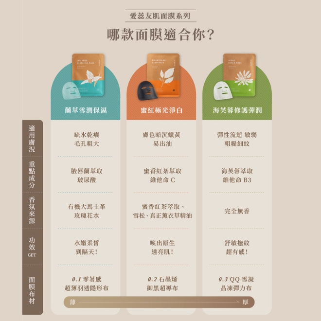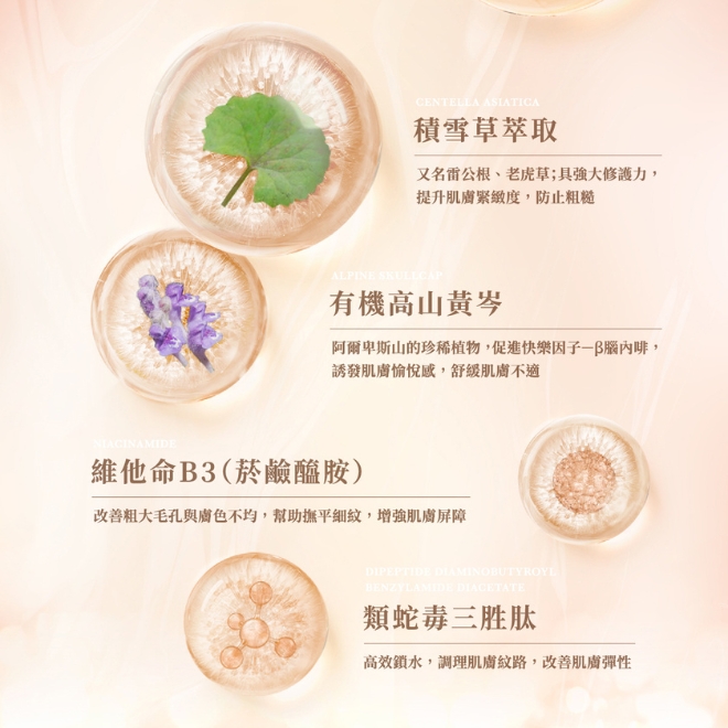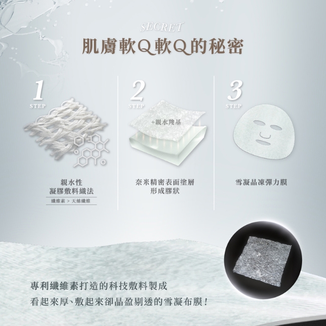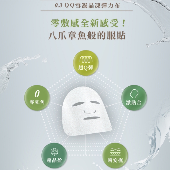 以零膚感全新感受的QQ雪凝晶凍彈力布,添加馬祖峭壁野生在地成分-海芙蓉、糖基海藻糖、積雪草萃取、有機高山黃岑、維他命B3、類蛇毒三胜肽,幫助撫平細紋,增強肌膚屏障,高效鎖水,調理肌膚紋路,改善肌膚彈性,是安撫躁動肌膚,肌膚緊緻穩定的秘密武器。