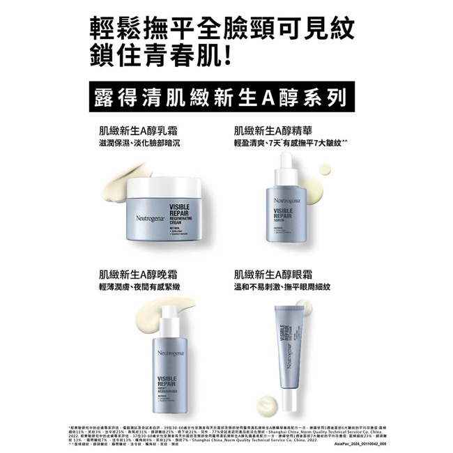[露得清®A醇產品系列] 萬眾期待 強勢登場!7天撫平7大皺紋* 鎖住青春肌淡化暗沉 X 透亮緊緻 X 溫和保濕不易刺激露得清®肌緻新生A醇乳霜,質地滋潤保濕,溫和安撫精萃降低刺激性,每日使用OK!A醇新手也適用!.適用於一般肌、乾性肌露得清®肌緻新生A醇眼霜,淡化眼周細紋和黑眼圈,溫和安撫精萃降低刺激性,每日使用OK!A醇新手也適用!.精純A醇 : 經皮膚專家證實,有助於淡化細紋、暗沉和皺紋.肌肽 : 鞏固肌膚緊緻度和彈性.溫和安撫精萃 : 減少肌膚不適感*面頰細紋、額頭皺紋、眉間皺紋、法令紋、嘴角紋、笑紋、頸紋-------------------------------------------------------------------------------------------------.所有膚質皆適用.無添加Paraben、無添加礦物油、無添加染料 .質地輕盈不黏膩,好吸收,可每日使用 .外包裝使用可回收材質,為愛護地球盡一份心力
