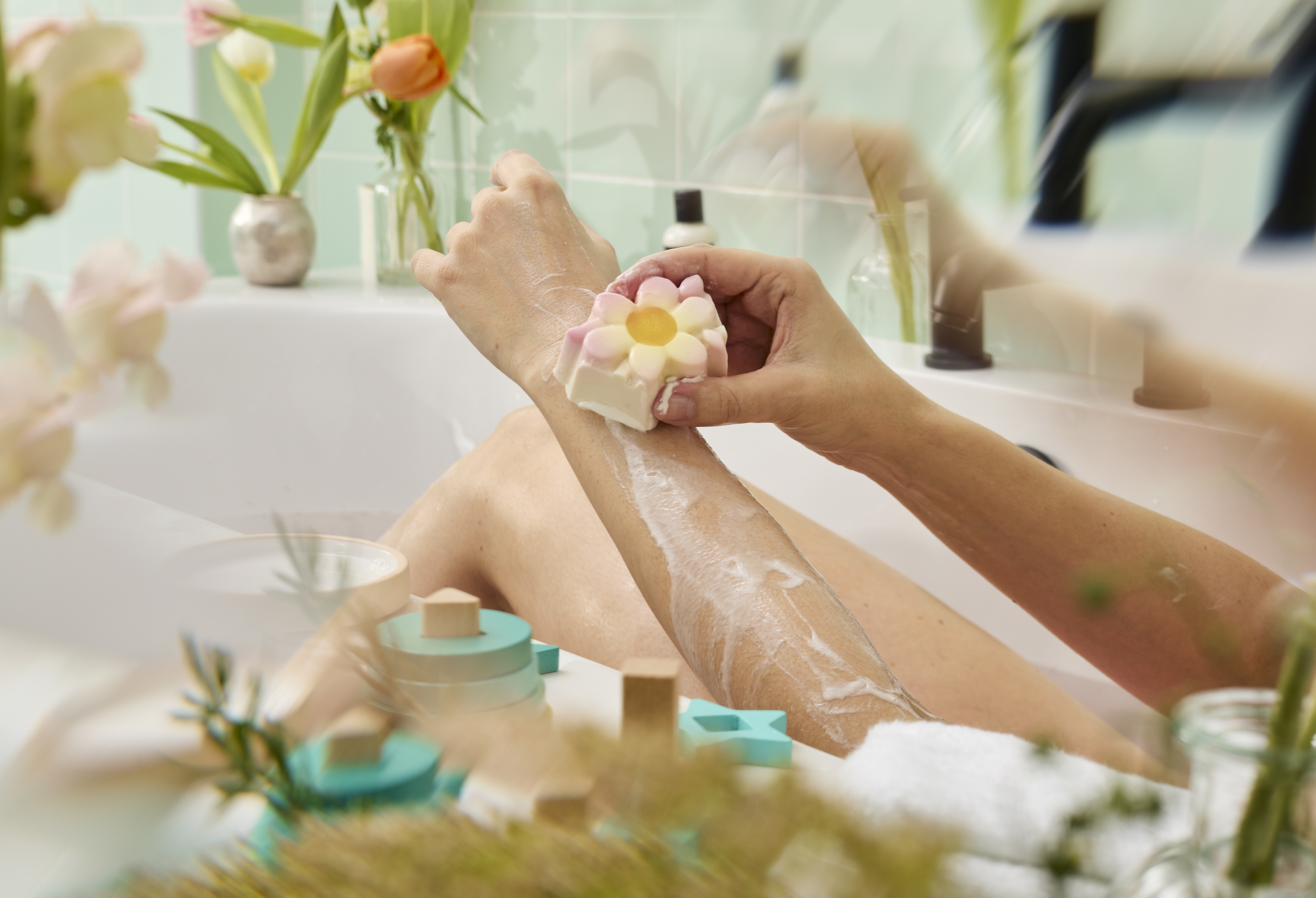- 香氛皂:在濕潤的肌膚上搓揉起泡,以柔滑泡沫來清潔身體,再用水沖淨。