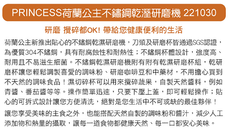 品名:荷蘭公主不鏽鋼乾溼研磨機型號:221030電壓:110V功率:200W尺寸:10×10×20cm重量:1.07kg設計:荷蘭設計產地:中國製造
