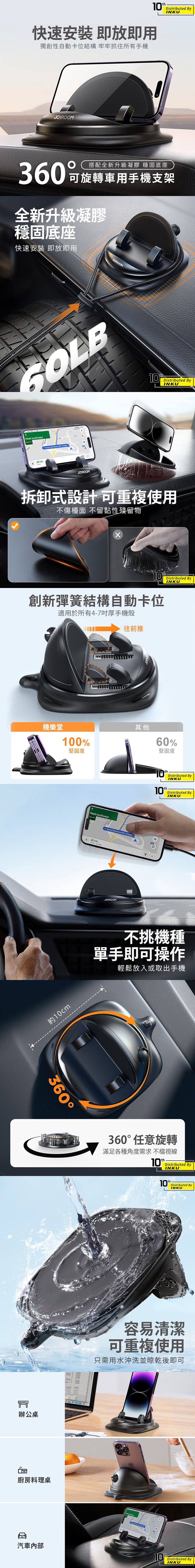快速安裝 即放即用搭配全新升級凝膠 穩固底座 創新彈簧結構自動卡位角度可調整 360°旋轉告別反光磁吸理線夾設計 充電更方便可重複使用 只需用水沖洗並晾乾後即可不挑機種單手即可操作