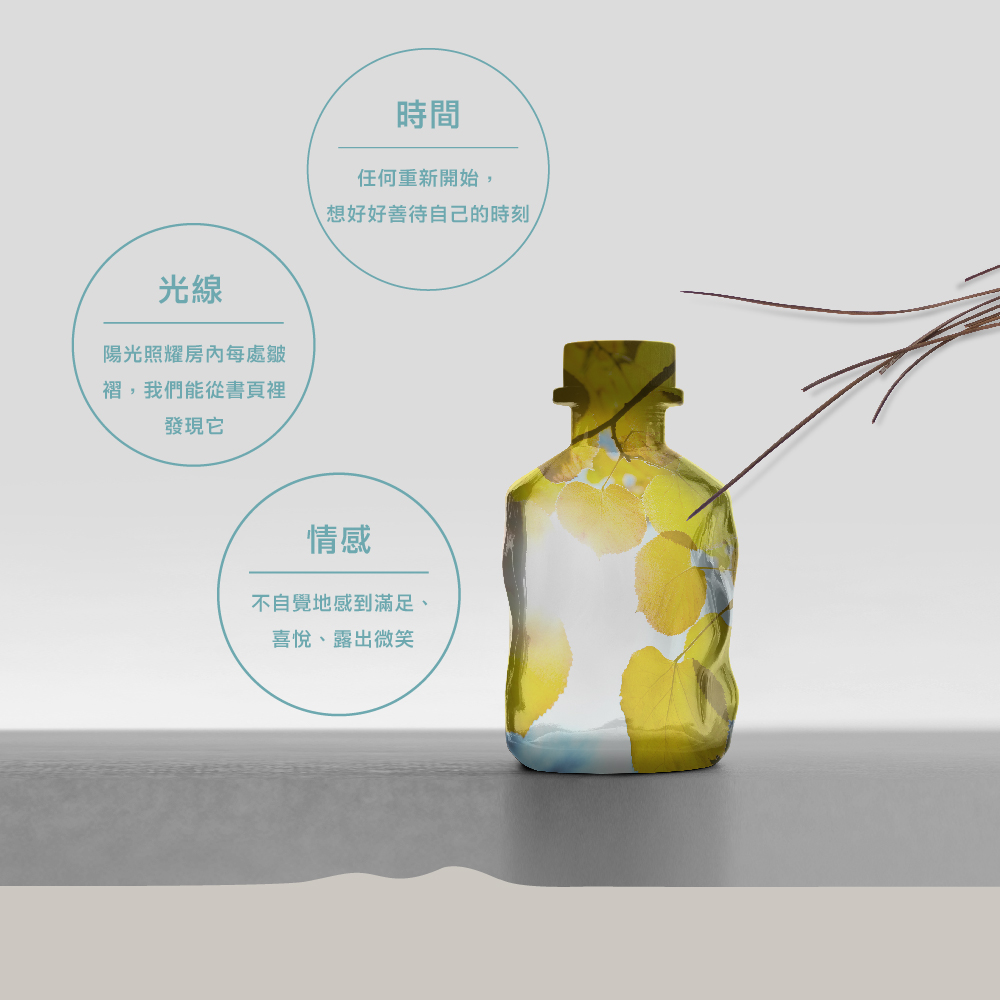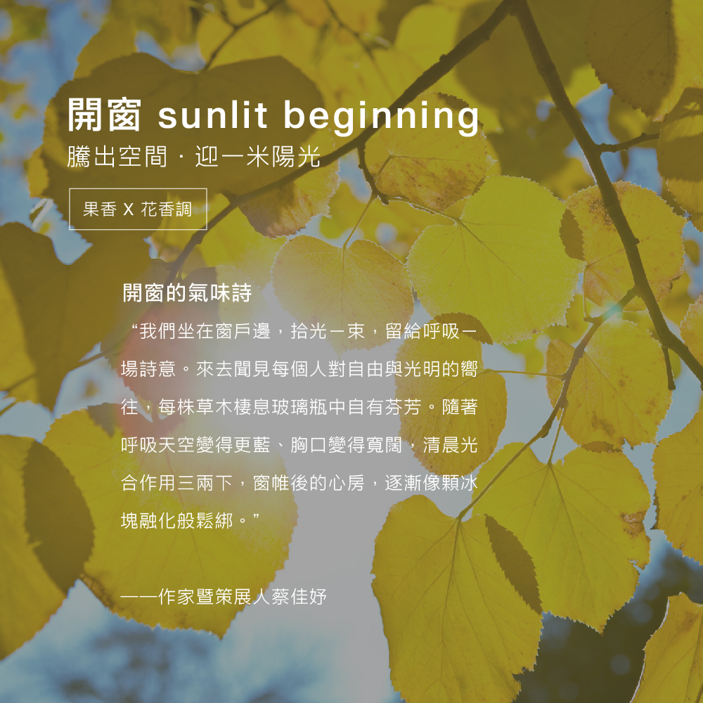 開窗的氣味詩“我們坐在窗戶邊,拾光ㄧ束,留給呼吸ㄧ場詩意。來去聞見每個人對自由與光明的嚮往,每株草木棲息玻璃瓶中自有芬芳。隨著呼吸天空變得更藍、胸口變得寬闊,清晨光合作用三兩下,窗帷後的心房,逐漸像顆冰塊融化般鬆綁。”
