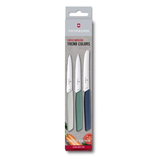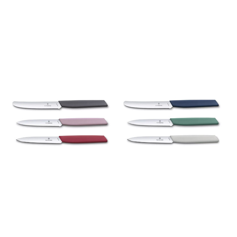 引領潮流的三件裝助您一一應付所有廚房工序。削皮刀組合包括圓頭的超鋒利波浪形刀刃蕃茄刀,適合用作處理硬皮的蔬果;尖頭的直刃及波浪形刀刃削皮刀方便切開蔬果及其他食材。每件產品均配備可用洗碗機清洗的合成手柄,並有多款高雅的時尚色彩可供選擇。 包含: Swiss Modern 蕃茄刀,波浪形刀刃,11 厘米 Swiss Modern 削皮刀,波浪形刀刃,10 厘米 Swiss Modern 削皮刀,直刃,10 厘米