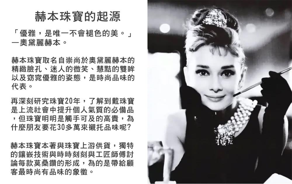 赫本珠寶誕生於創辦人對女人的深刻理解——那份疼惜自己、不願將就的底氣,化作一道畫龍點睛的光,點亮屬於妳的不凡。