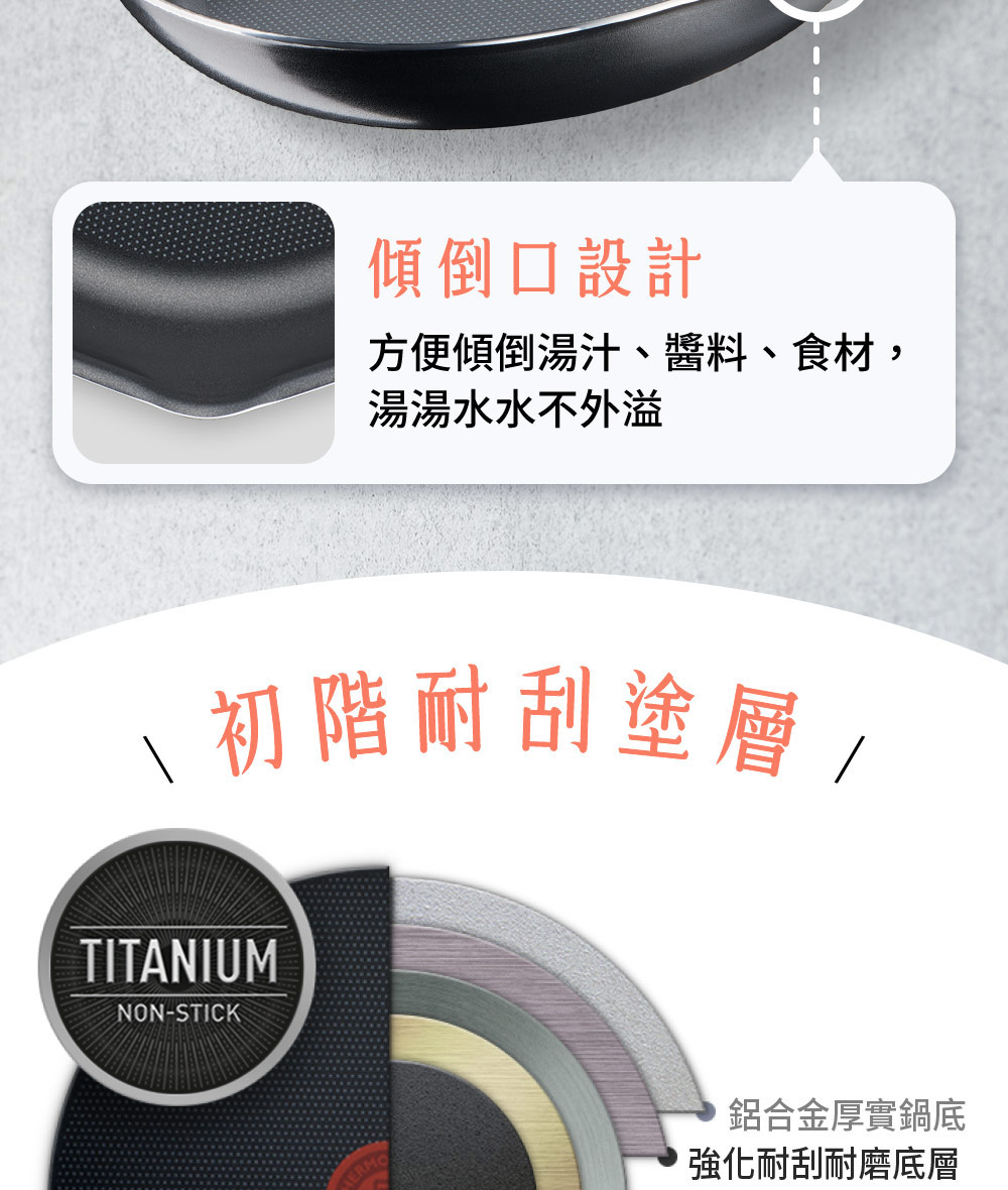 ◆大面積平底,適合煎煮料理◆傾倒口方便傾倒湯汁/醬料/食材◆智慧佳溫紅心,掌握最佳烹調溫度◆法國製不沾塗層,耐磨抗刮好洗◆高效導熱底部,食材受熱無死角◆不含PFOA、重金屬,符合歐洲鍋具安全規定
