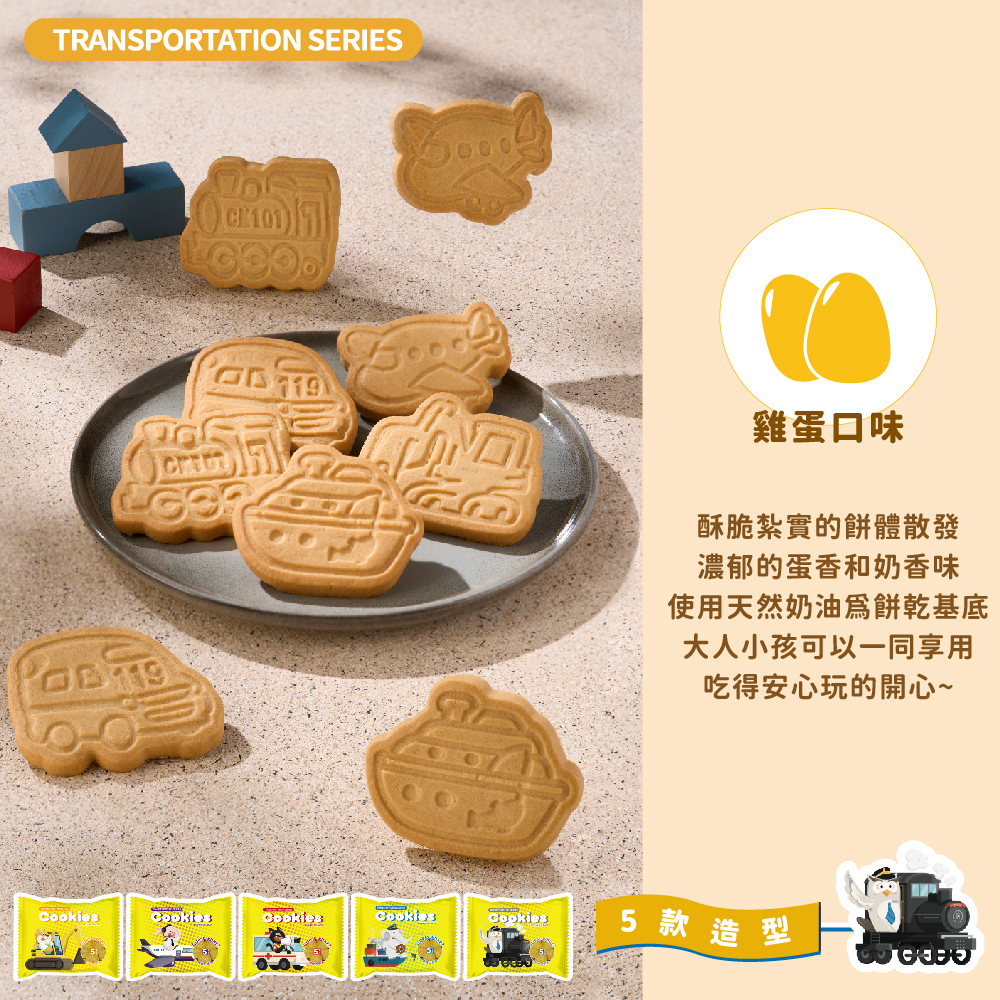 ✔️奶蛋素 / 天然奶油 / 單片獨立包裝✔️全新造型餅乾強勢登場!將大家最喜歡的五款交通工具,Q版復刻成美味餅乾。✔️可愛的交通工具搭配香濃雞蛋口味餅乾,酥脆紮實的餅體散發濃郁的蛋香和奶香味,使用天然奶油為餅乾基底,大人小孩可以一同享用,吃得安心、開心。✔️內盒特別設計為著色圖,還有搭配附贈的獨家貼紙,讓你邊吃邊玩更有趣。