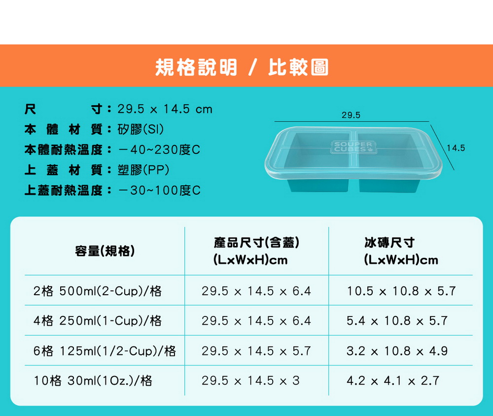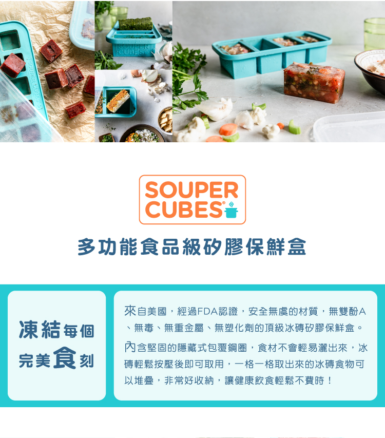 多功能食品級矽膠保鮮盒讓冷凍個人份量的湯品、嬰兒副食品、 醬料、 果汁等液 體變得更輕鬆簡單!採用100% FDA食品級頂級厚矽膠和鋼製邊緣製成,使盒身更加堅固避免溢出,好蓋又好裝。具有專利以及獨家設計的托盤,可製作10.5x10.8x5.7公分大小+5.4x10.8x5.7公分的冰磚。每一格內都顯示刻度可清楚測量裝入的容量。不含BPA的上蓋可緊密貼合,以防止溢出、避免盒內食物沾染其他異味並易於堆疊及收納。不含雙酚A可安心使用。 可進洗碗機清洗。本體可進烤箱,安全溫度至212度(上蓋請勿放入)