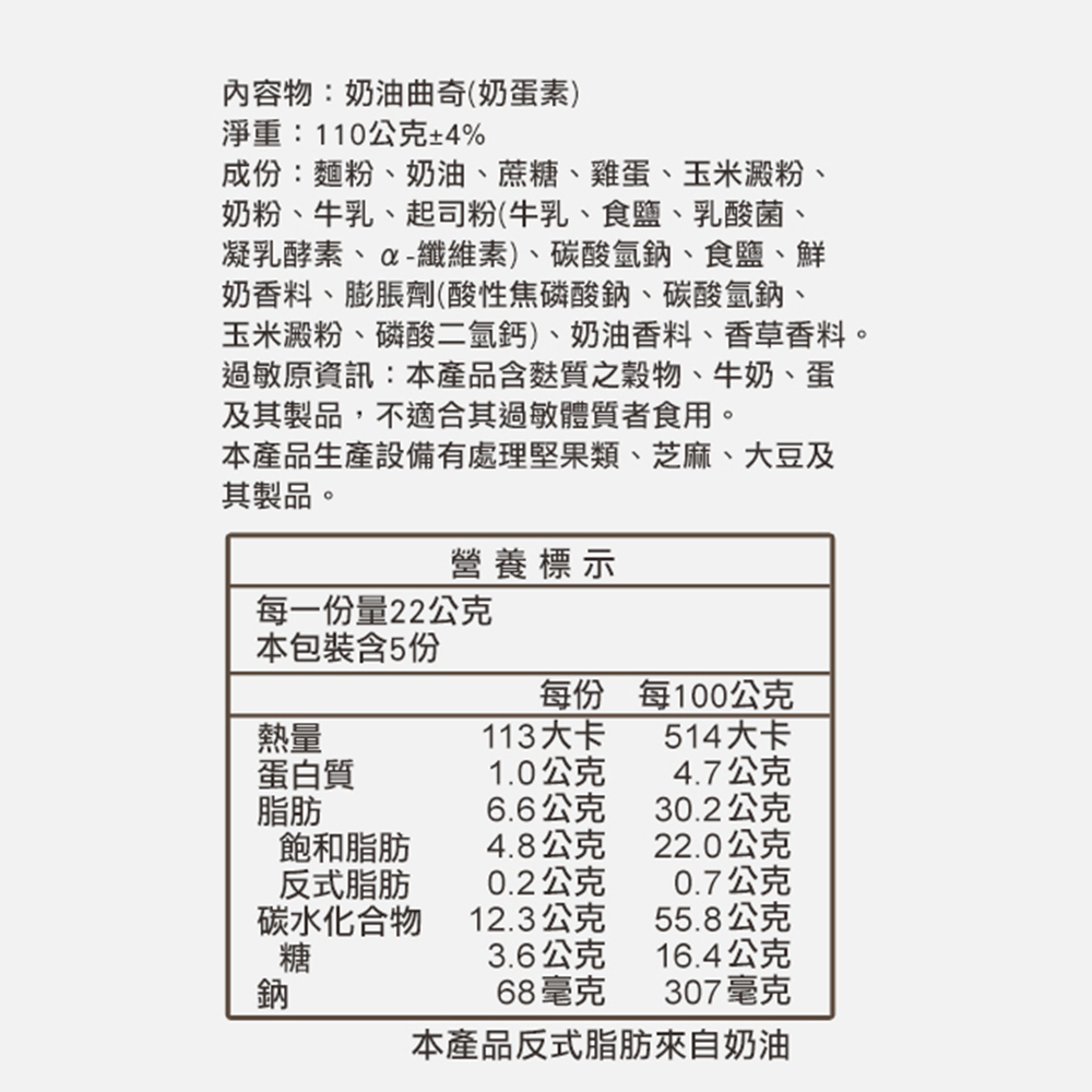 奶油曲奇:選用進口天然奶油,帶有發酵奶油的獨特香氣,餅體酥鬆紮實,添加牛奶與奶粉,口感滑順細緻,奶香十足純淨配方的午茶點心首選。